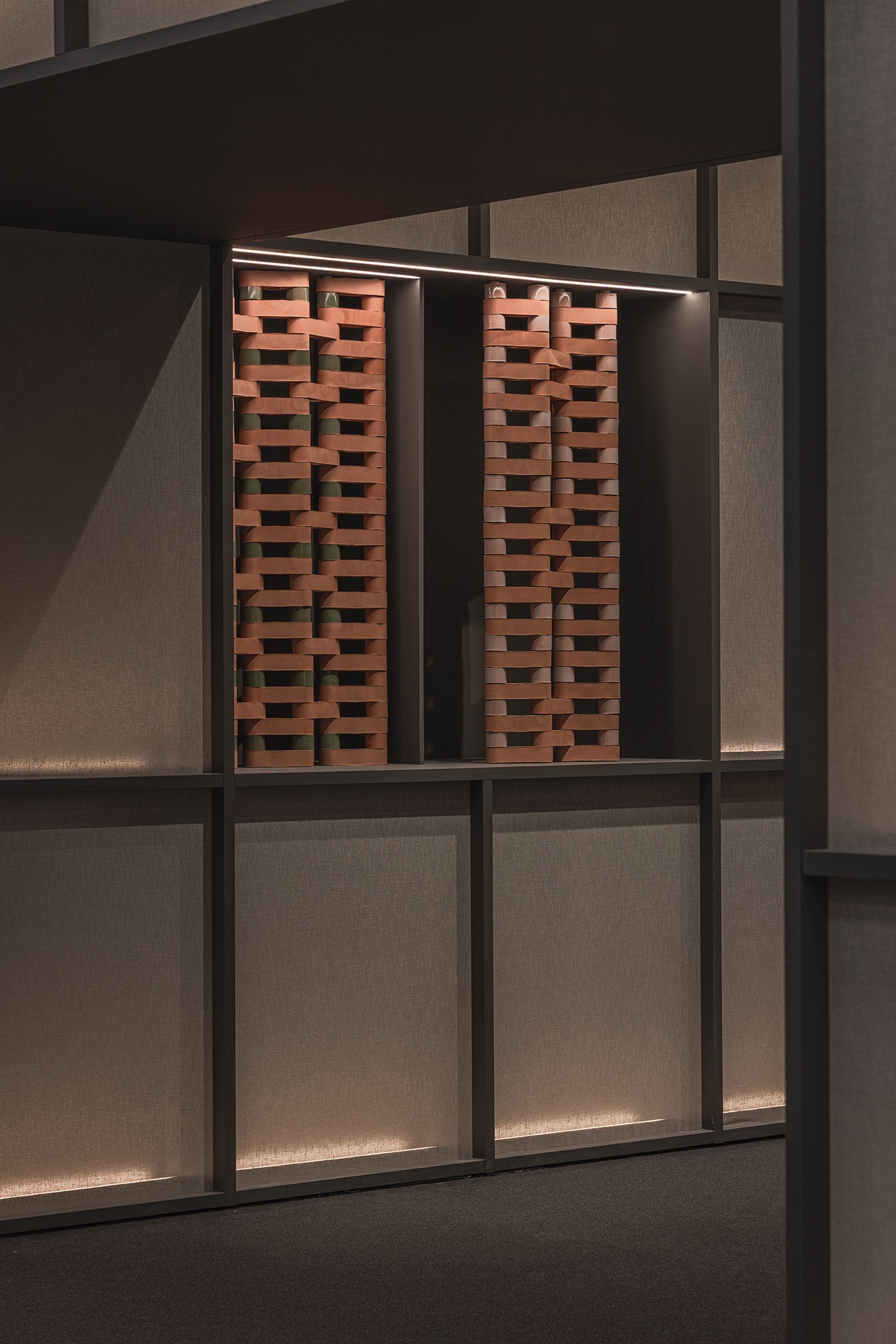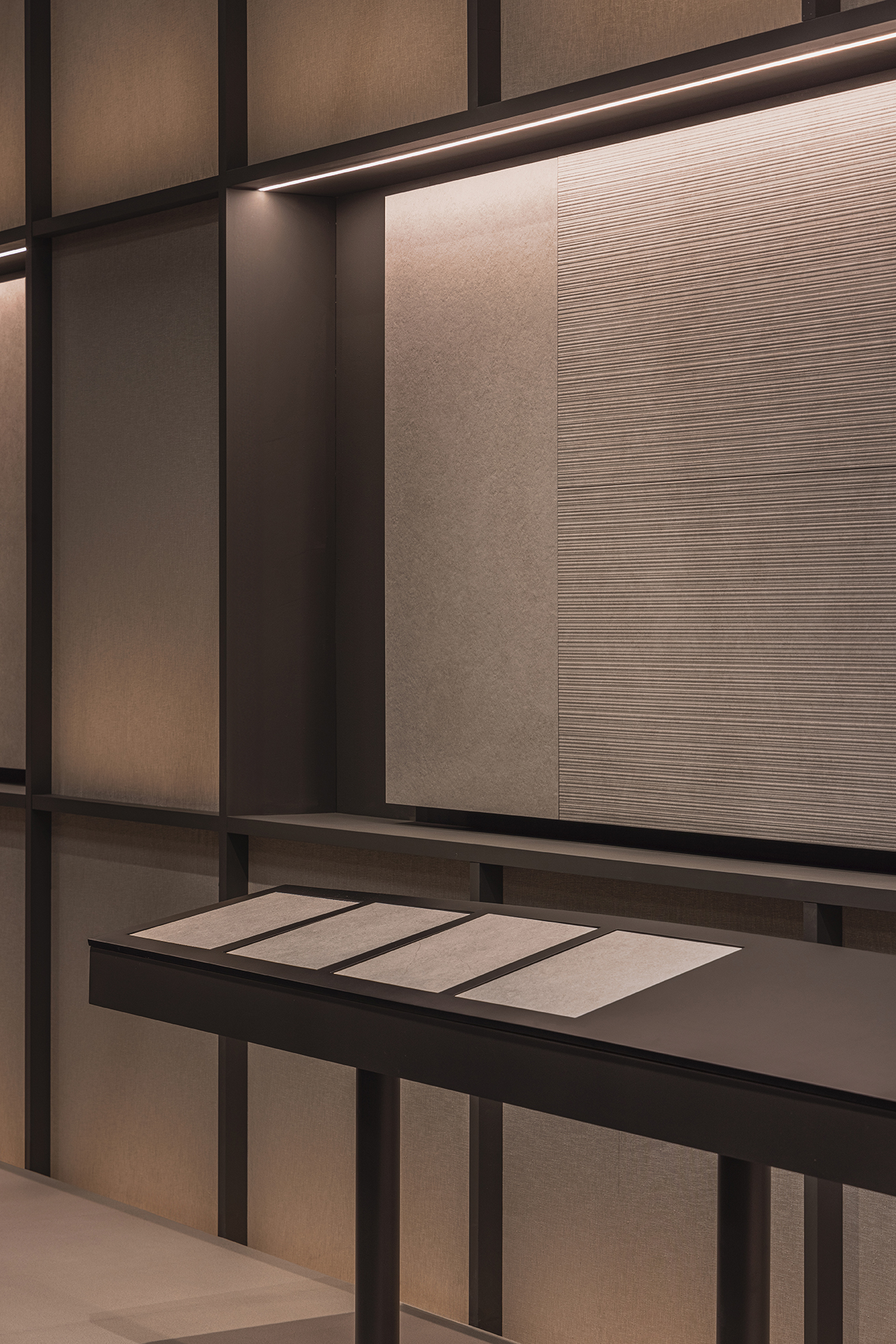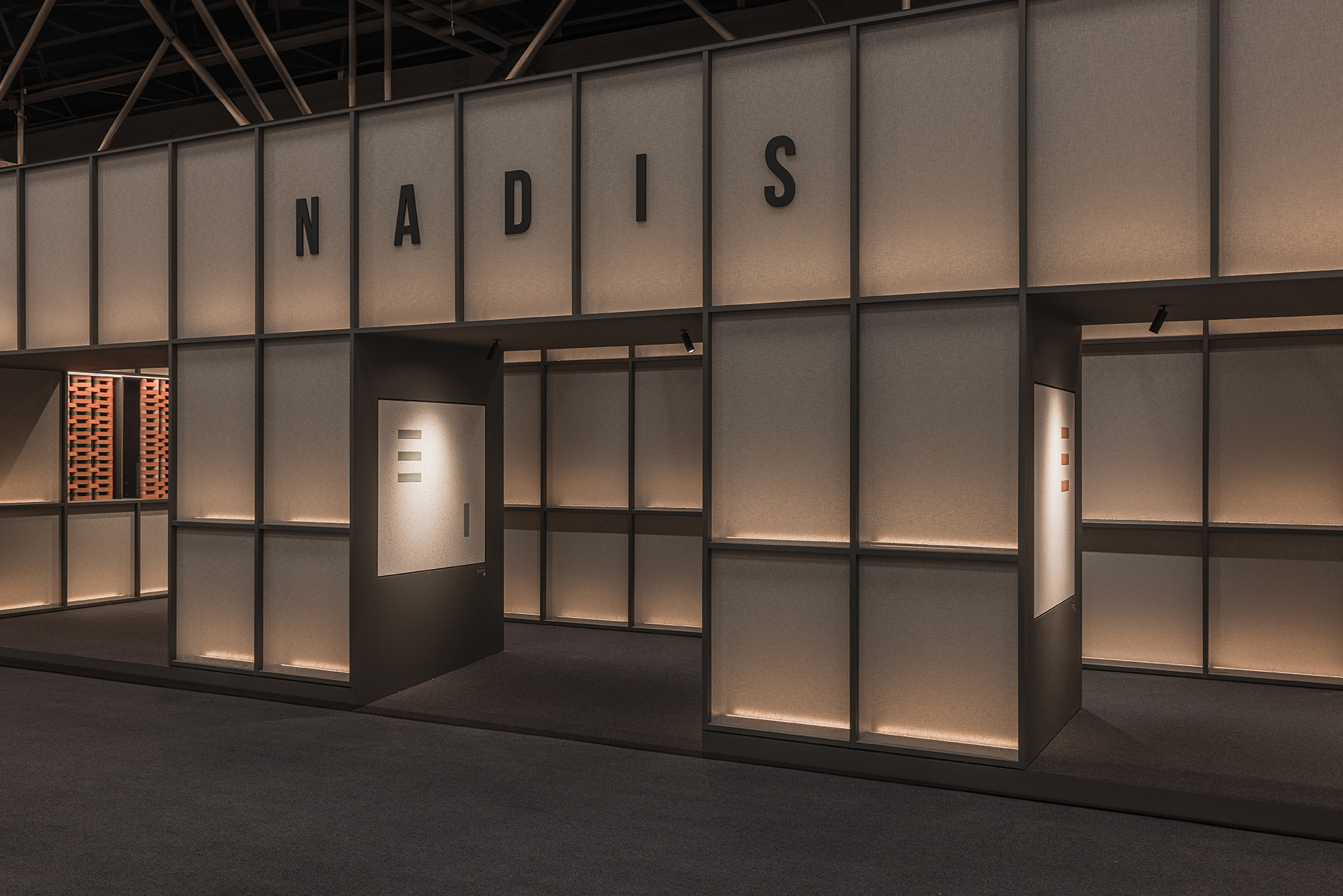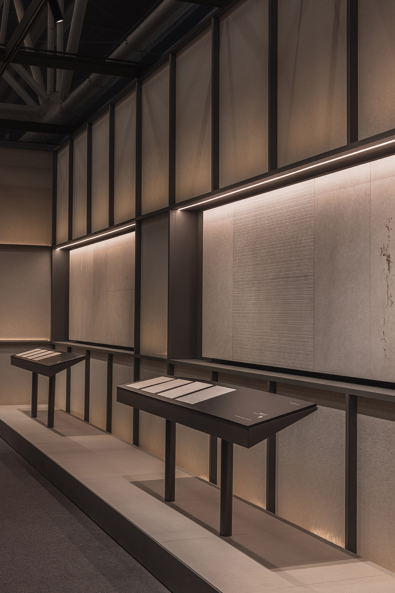 This stand designed for the Cersaie fair in Bologna takes inspiration from a museum-like approach. Tiles are displayed as if they were works of art and are also used to create key decorative elements, including the large hanging lamps and the meeting table.