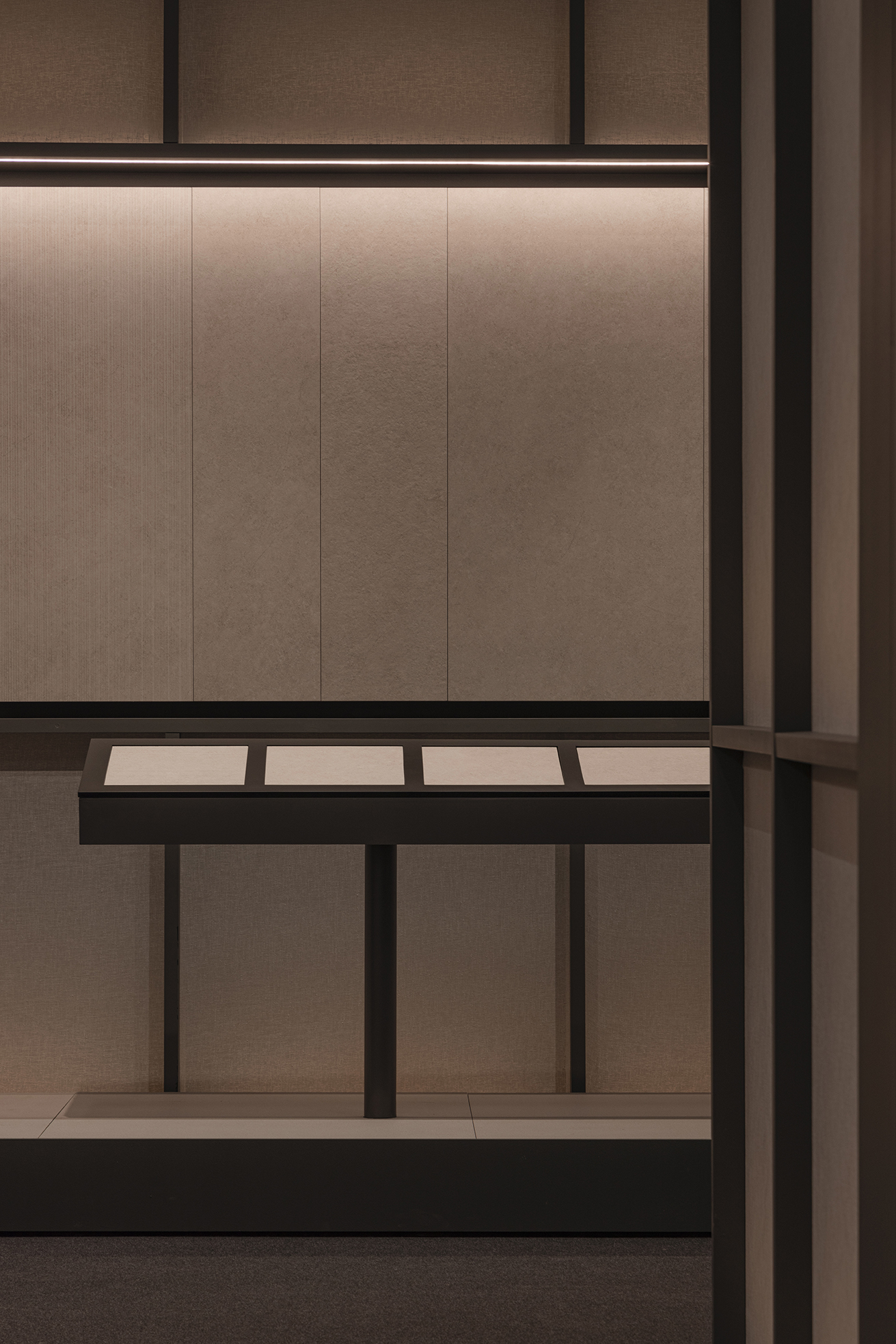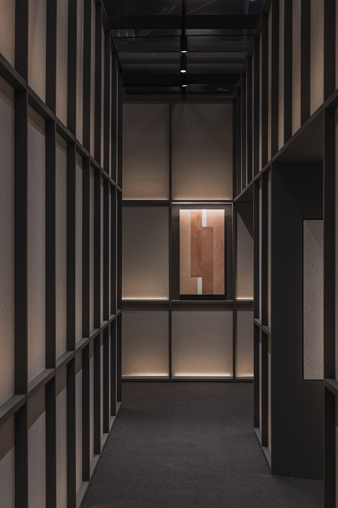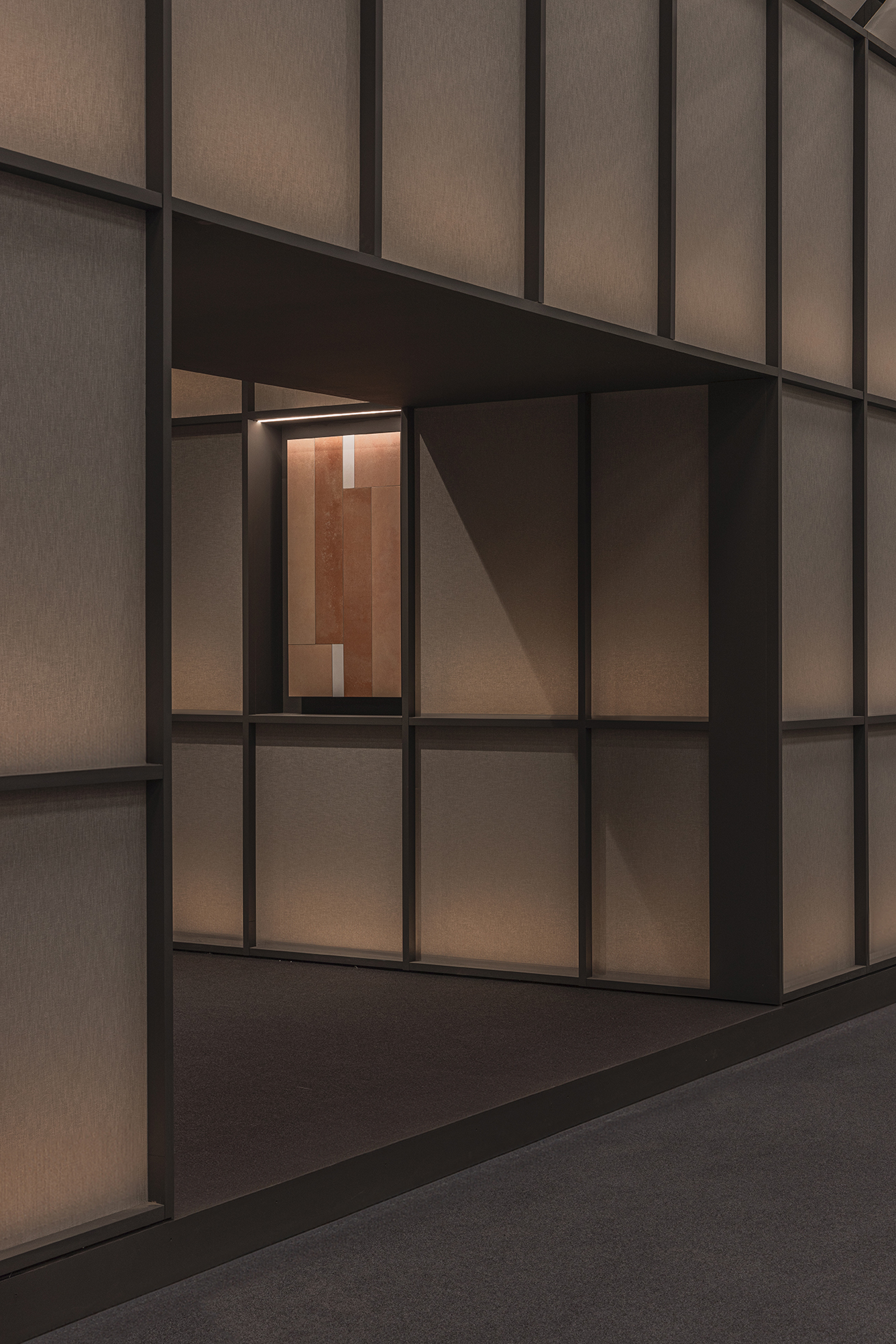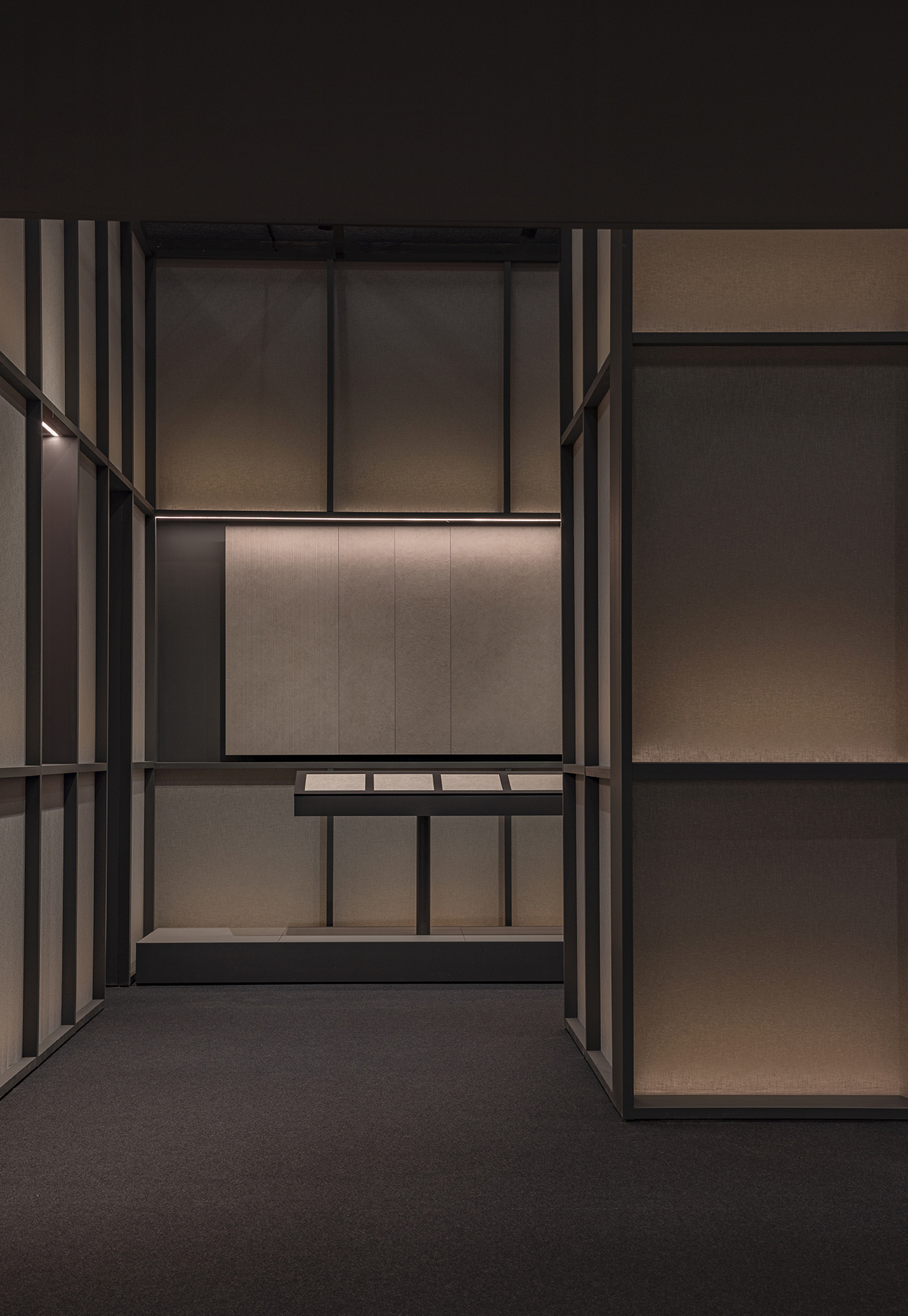 This stand designed for the Cersaie fair in Bologna takes inspiration from a museum-like approach. Tiles are displayed as if they were works of art and are also used to create key decorative elements, including the large hanging lamps and the meeting table.