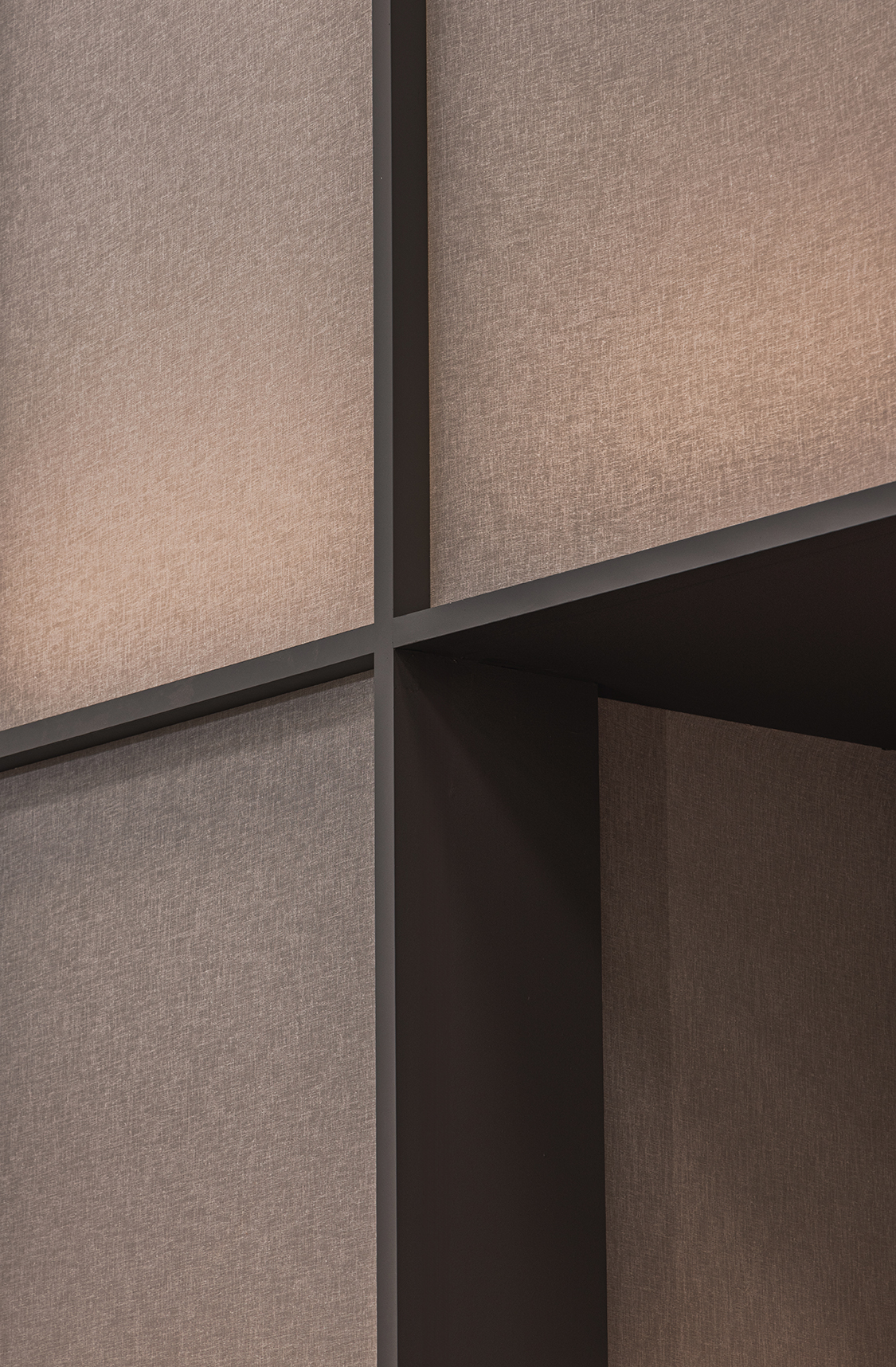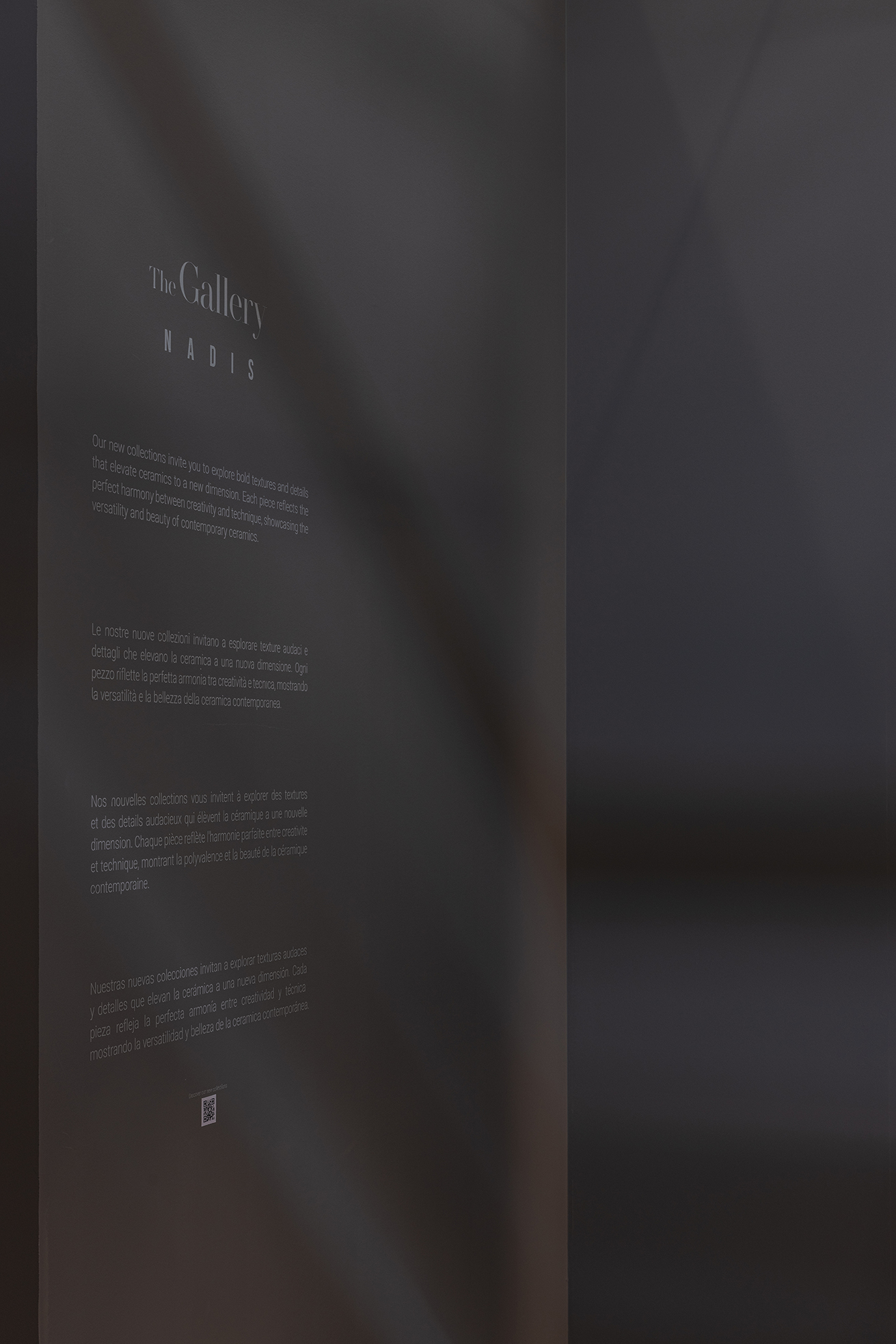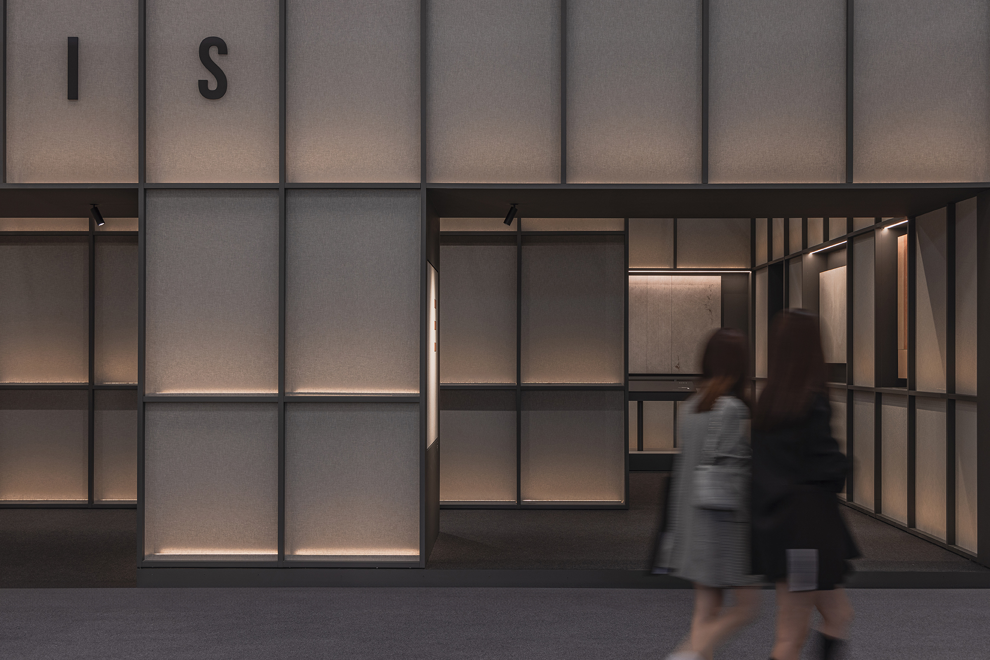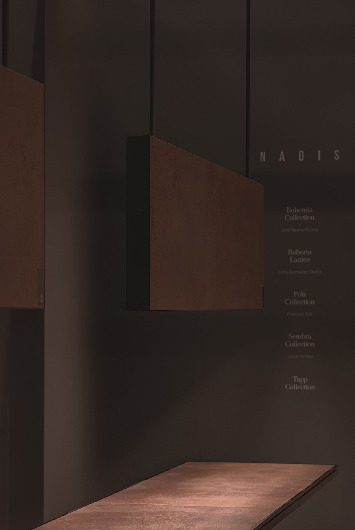 This stand designed for the Cersaie fair in Bologna takes inspiration from a museum-like approach. Tiles are displayed as if they were works of art and are also used to create key decorative elements, including the large hanging lamps and the meeting table.