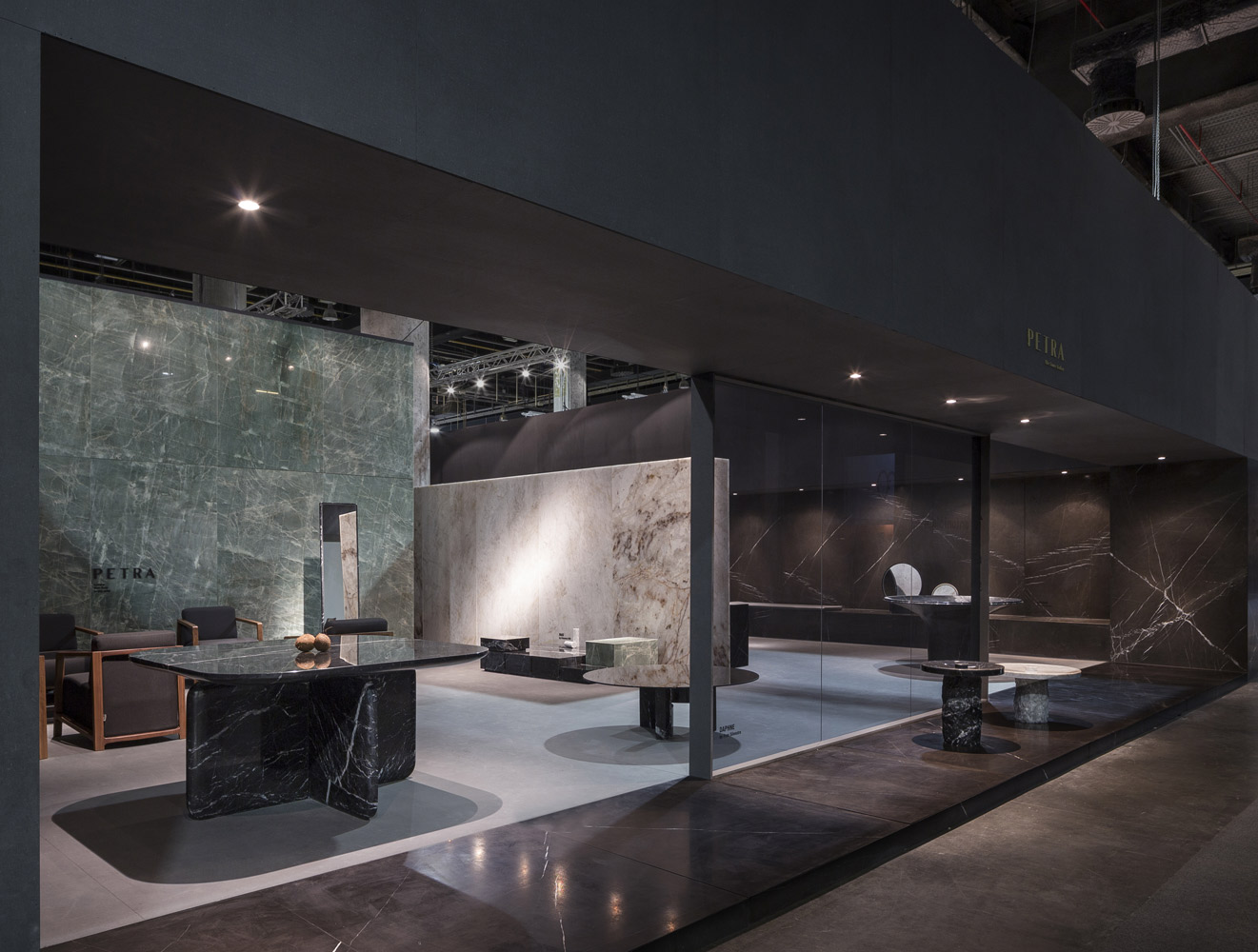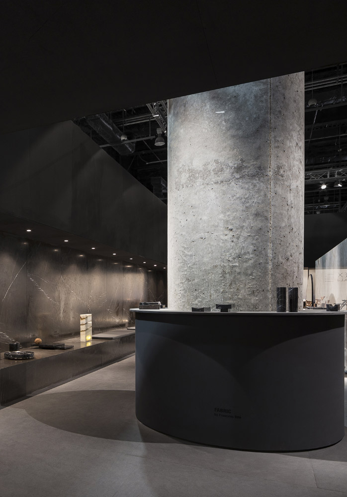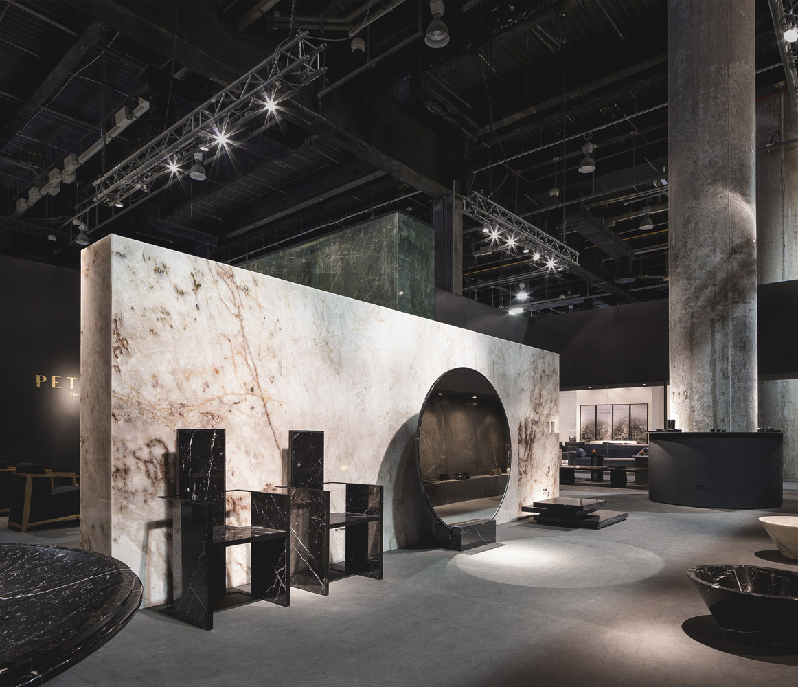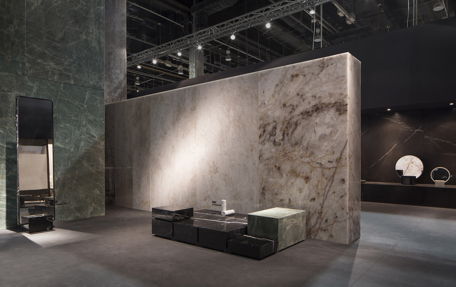 This stand is conceived as a dark backdrop that enhances the new marble furniture collection. Different stone varieties are showcased within a cohesive environment, where the contrast of textures and tones emphasizes the character of each piece.