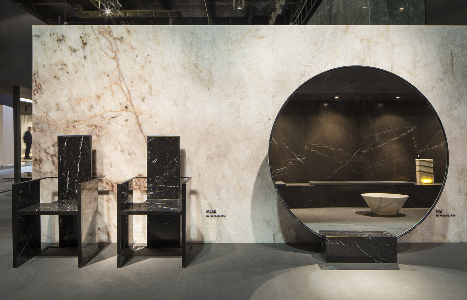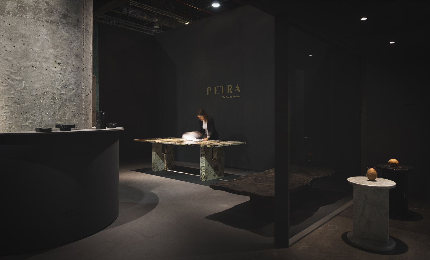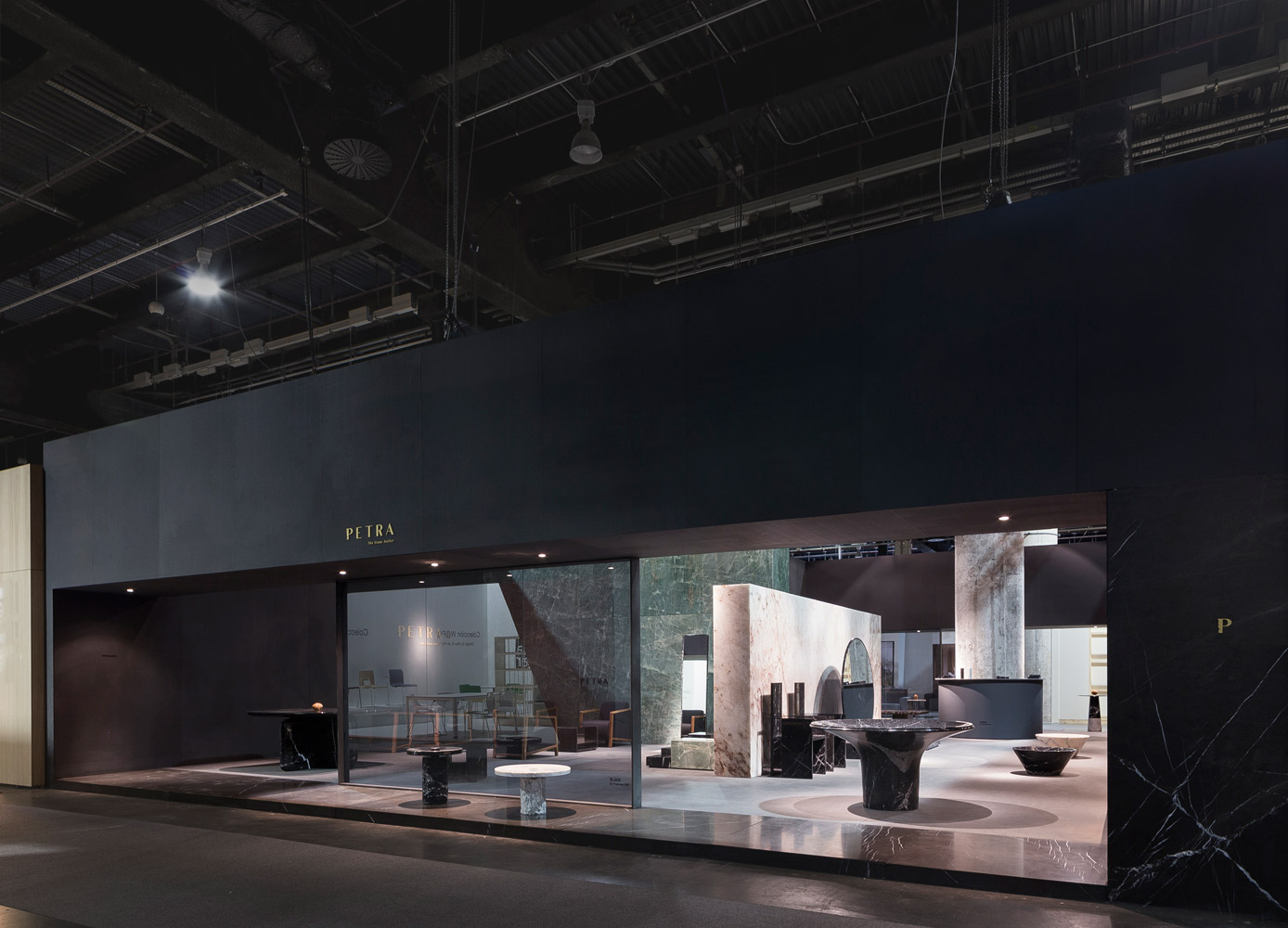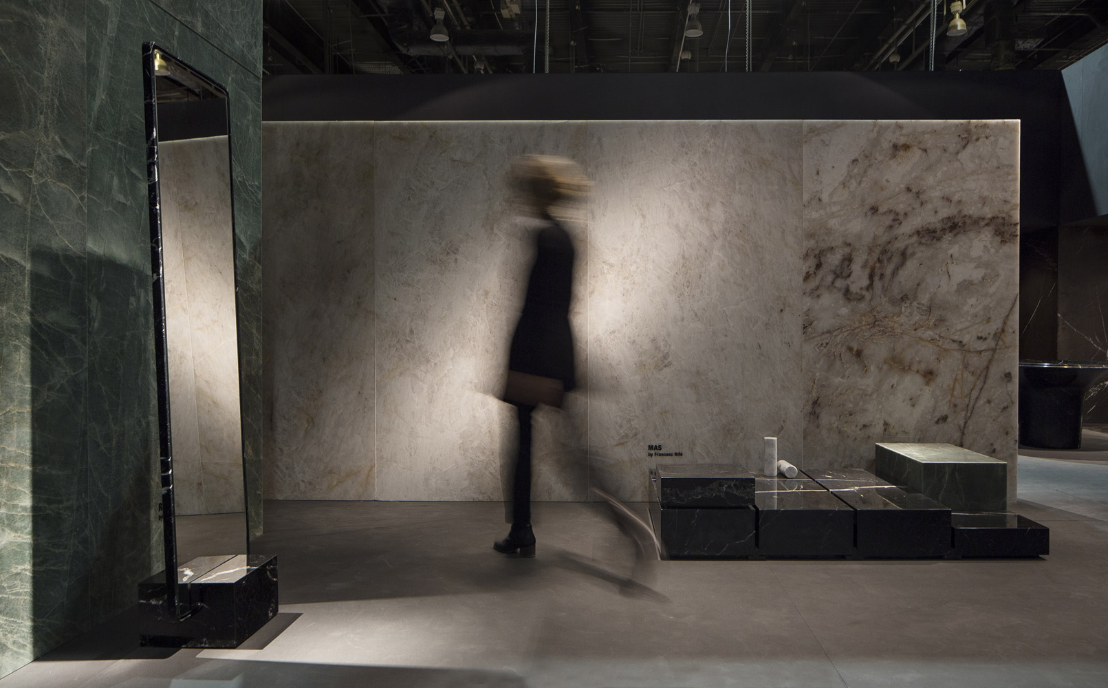 This stand is conceived as a dark backdrop that enhances the new marble furniture collection. Different stone varieties are showcased within a cohesive environment, where the contrast of textures and tones emphasizes the character of each piece.