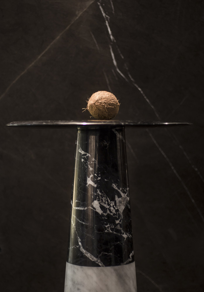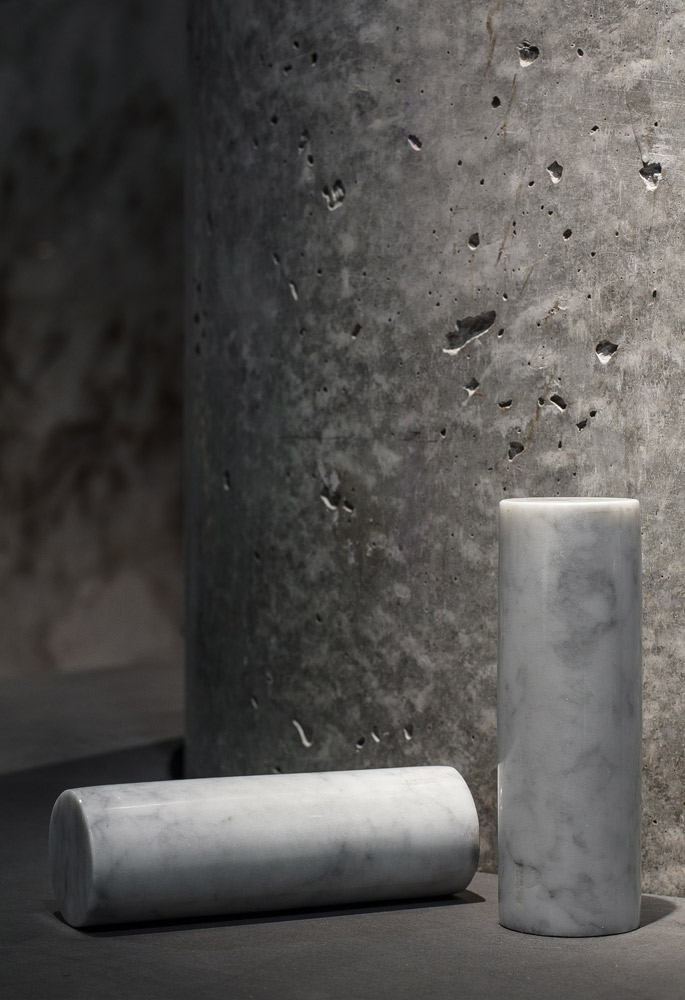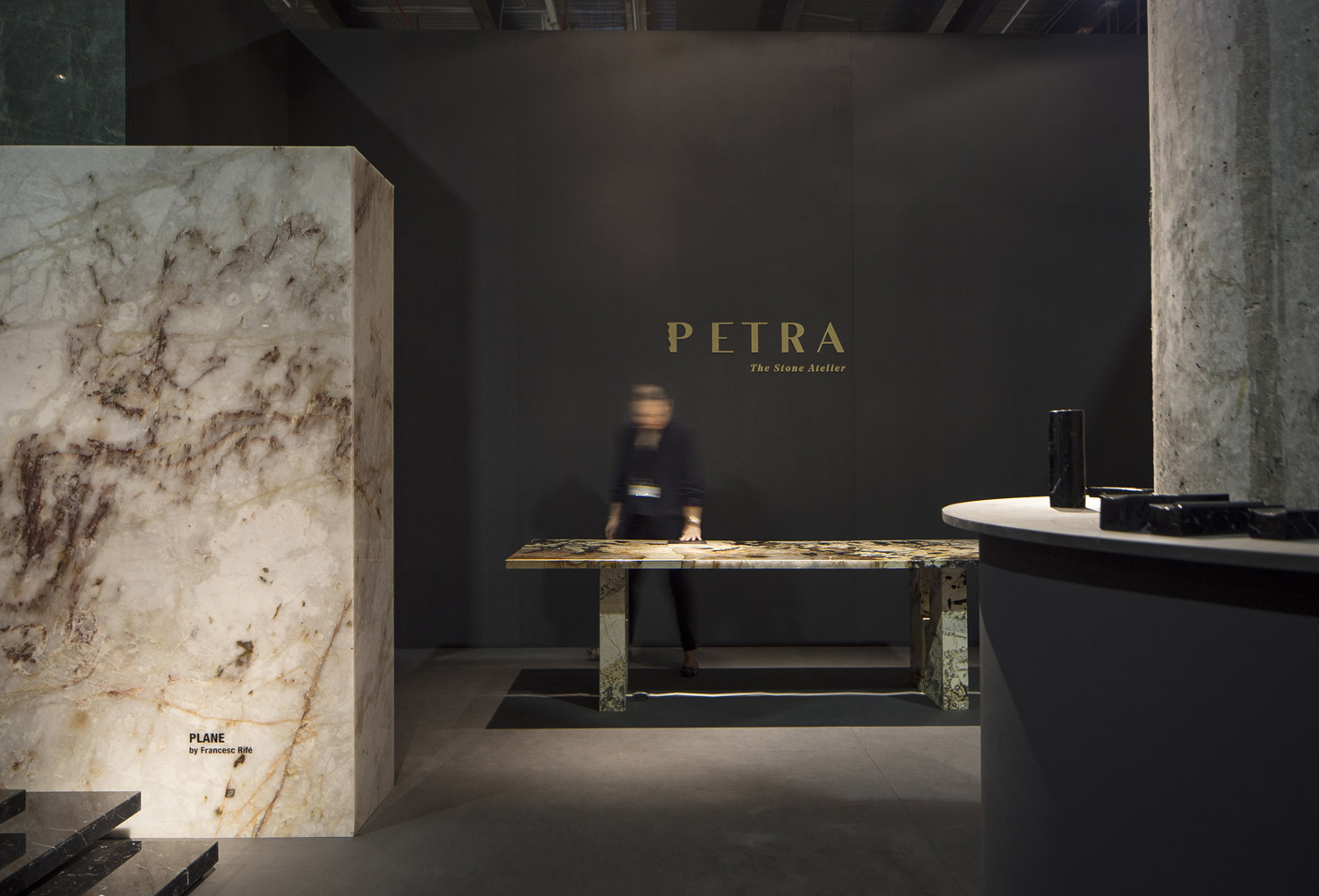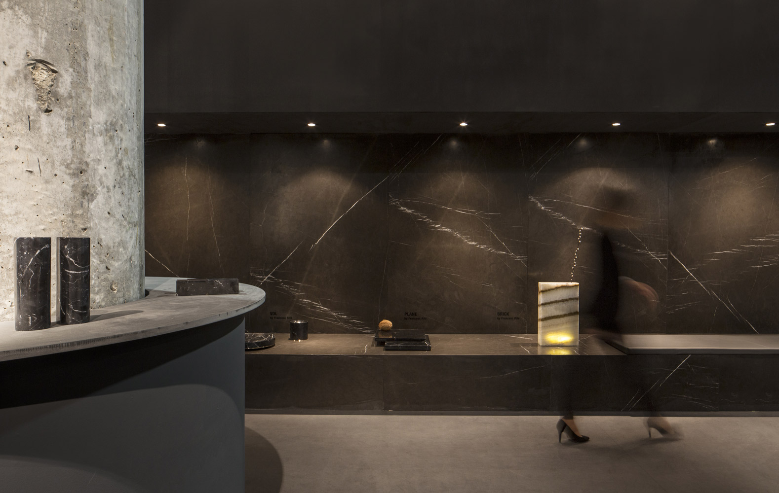 This stand is conceived as a dark backdrop that enhances the new marble furniture collection. Different stone varieties are showcased within a cohesive environment, where the contrast of textures and tones emphasizes the character of each piece.