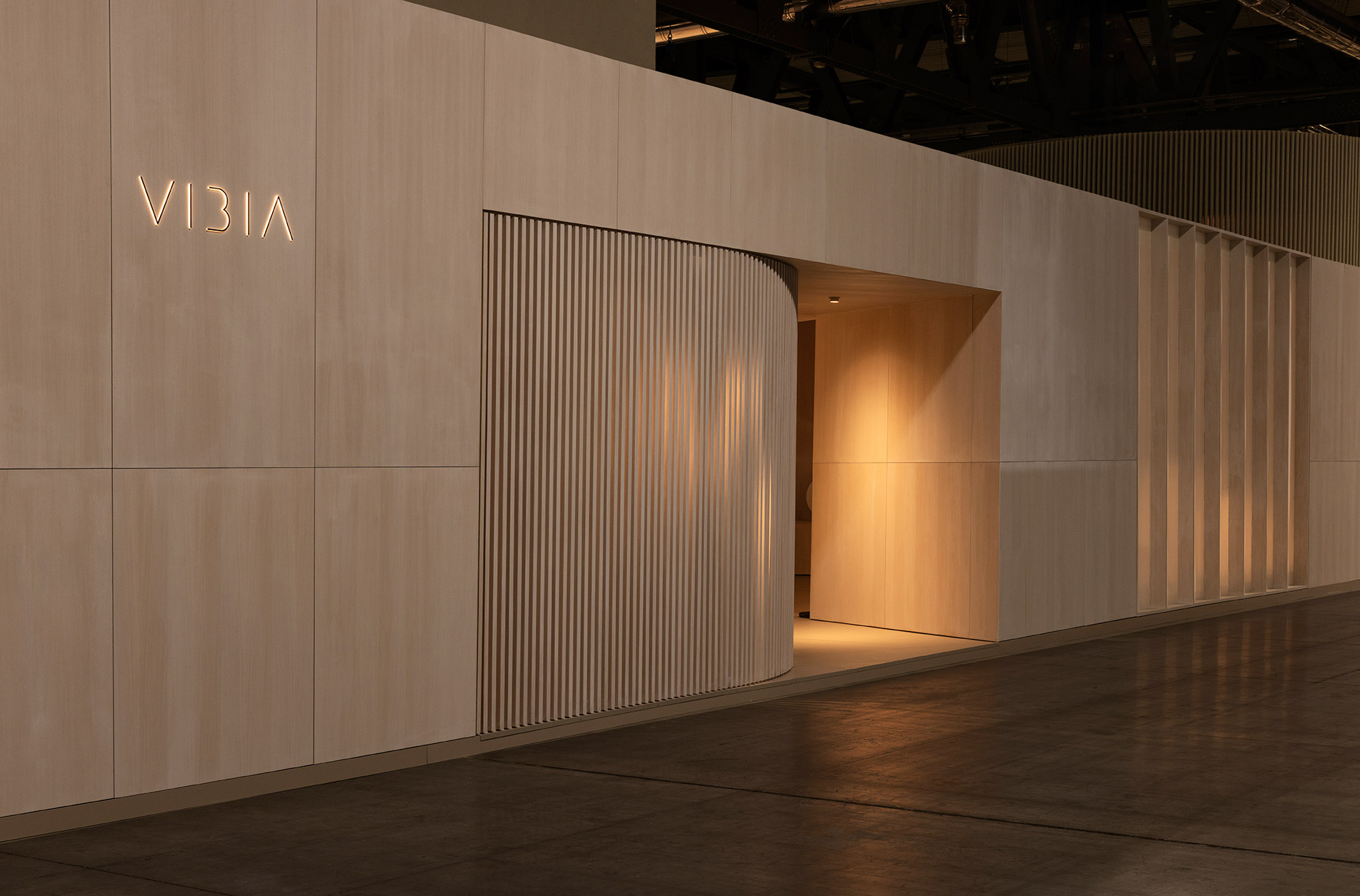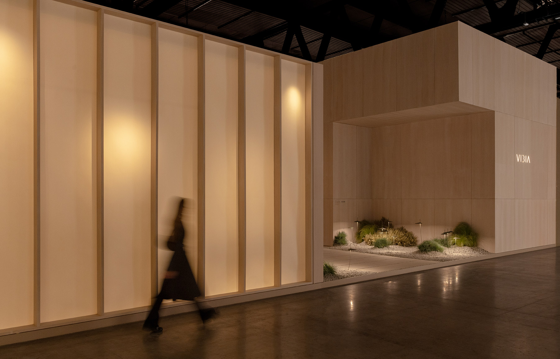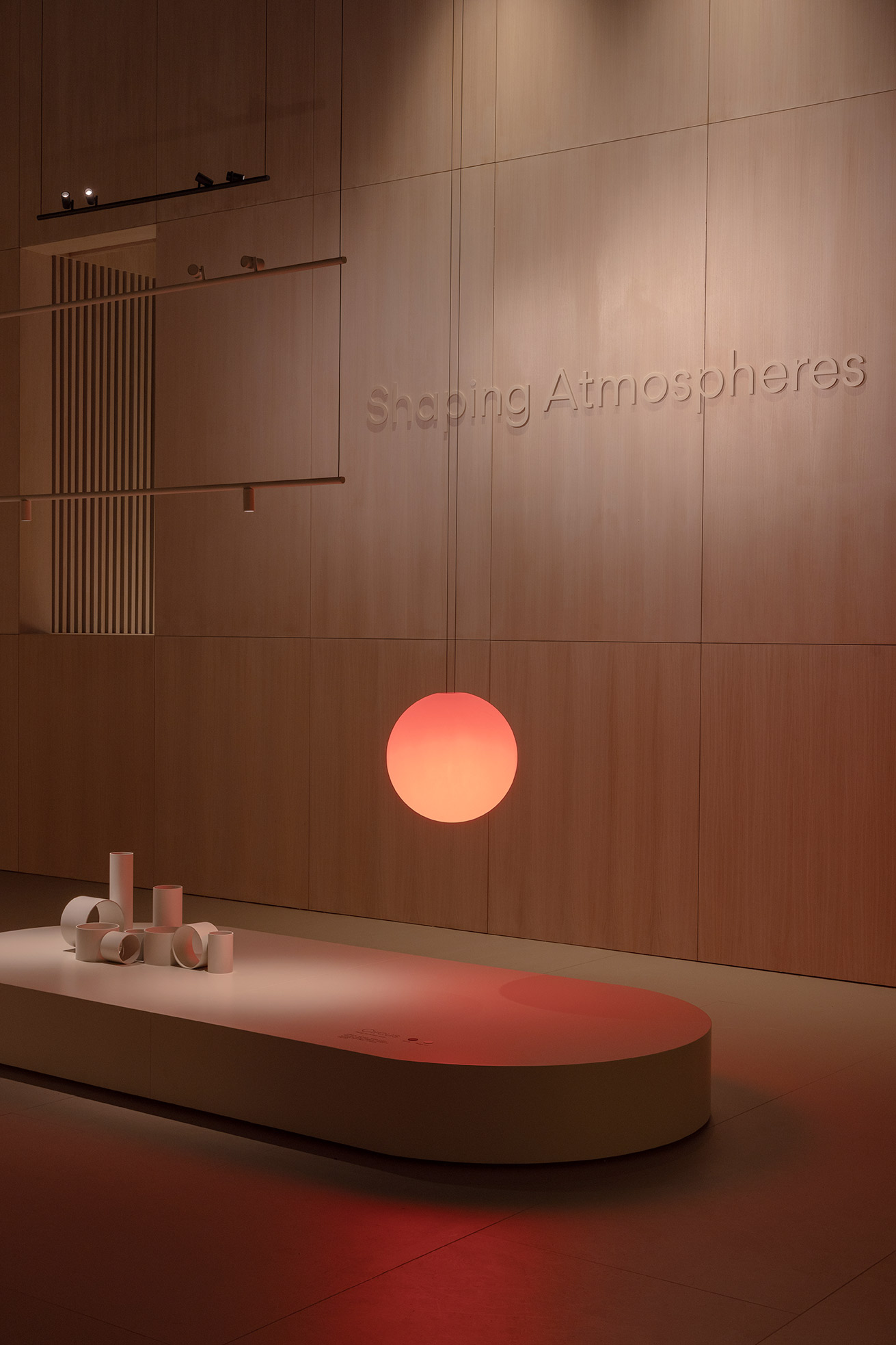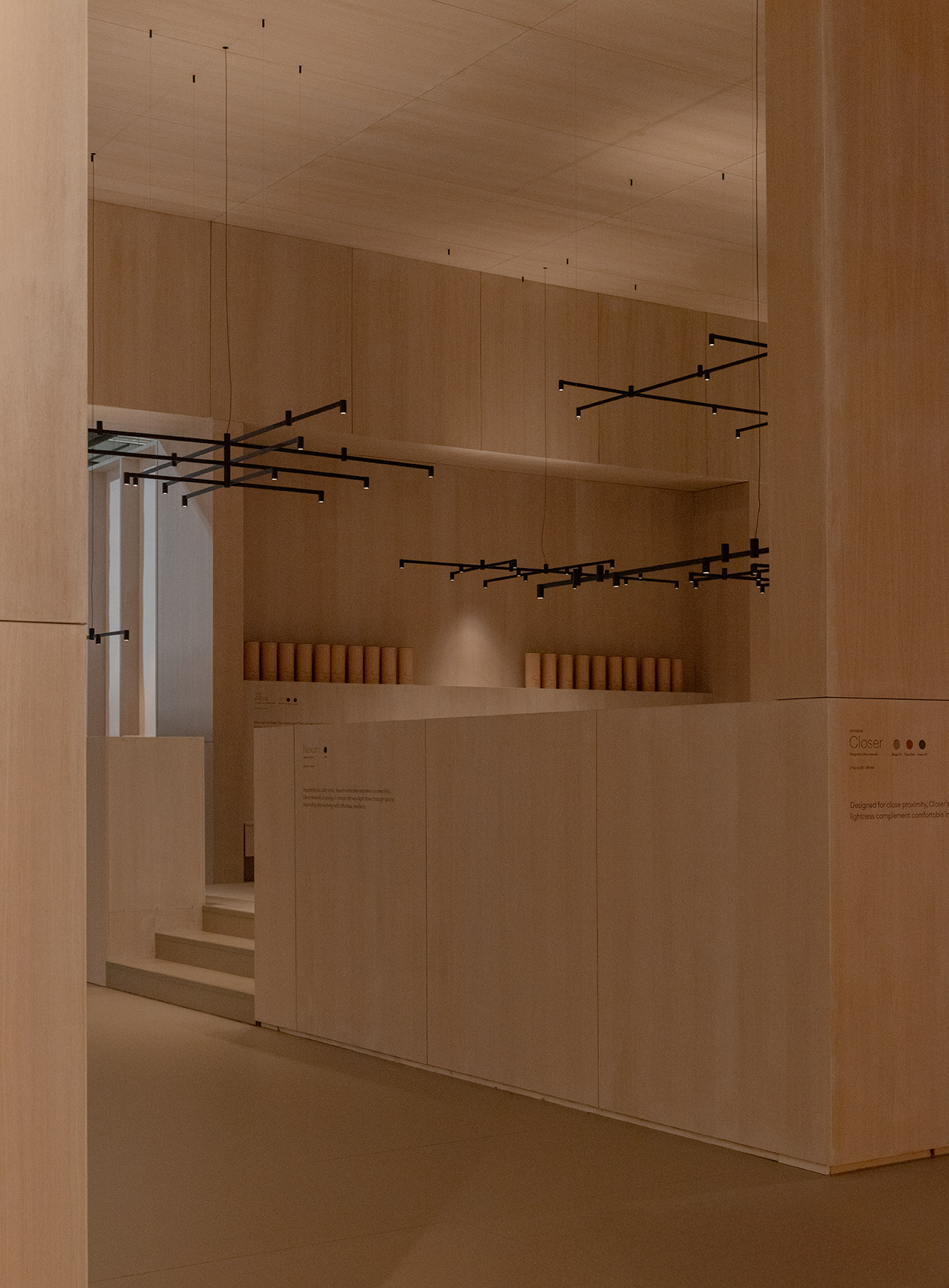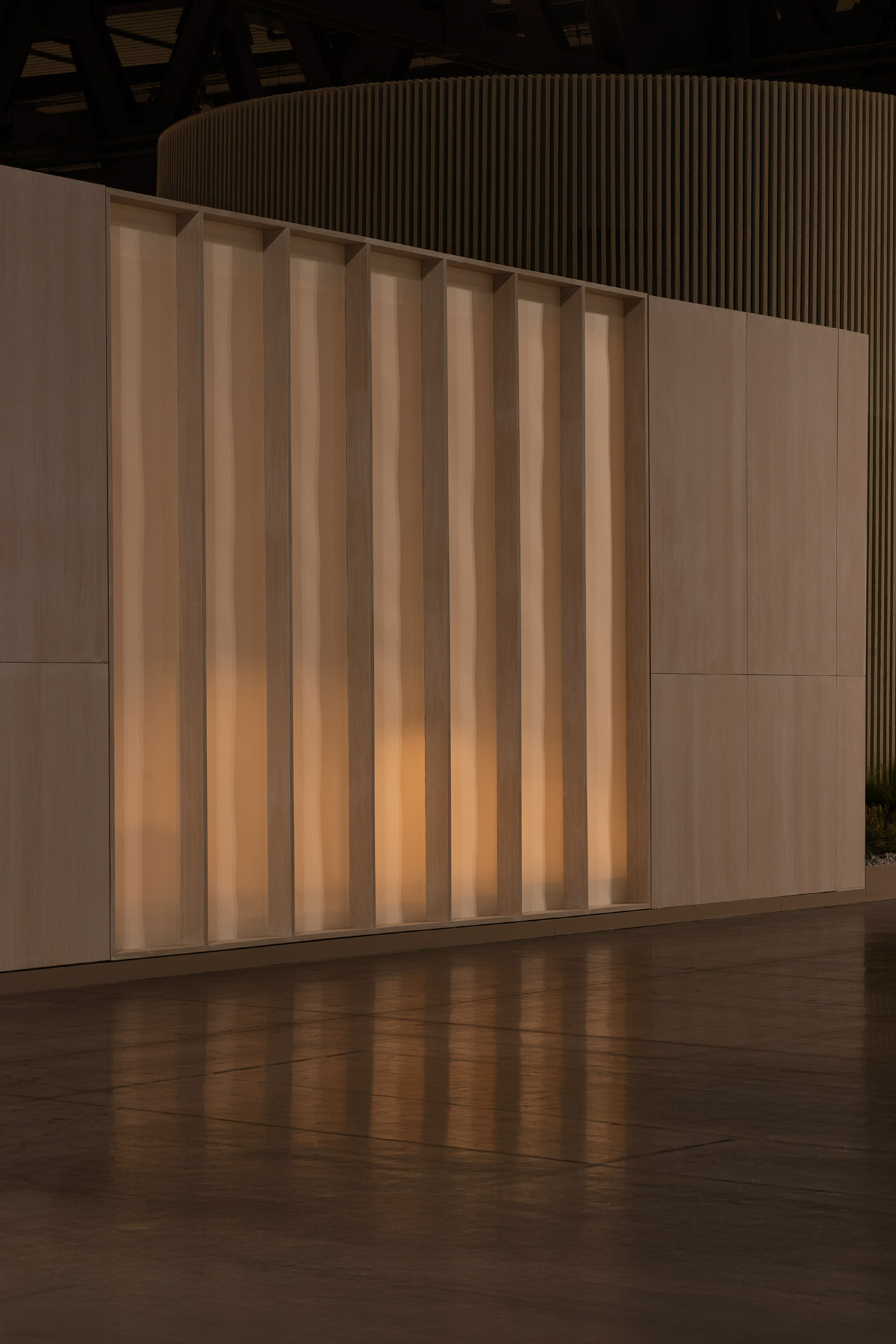 This project for Euroluce 2025 is built upon a paradox: enclosing light. From the outside, a sequence of vertical slats defines the spatial boundaries and frames a central structure — a box whose luminous skin is in constant transformation.