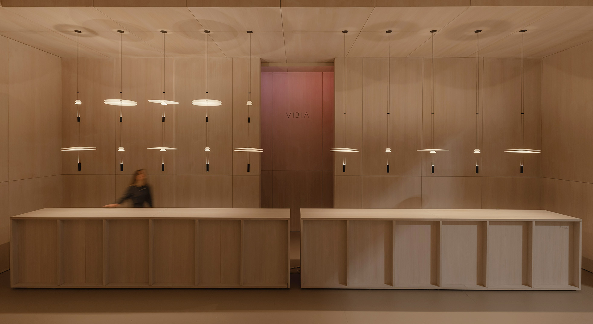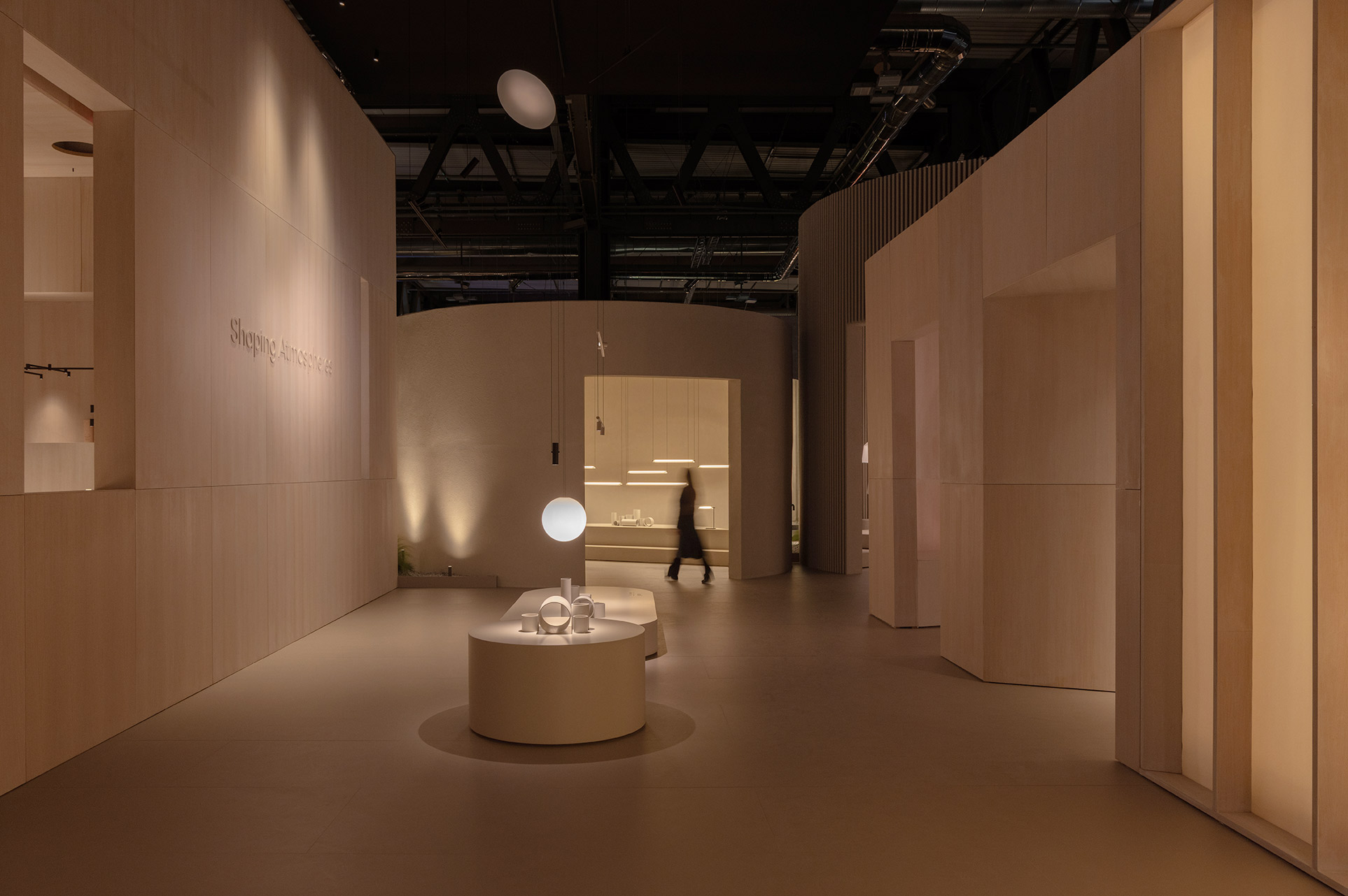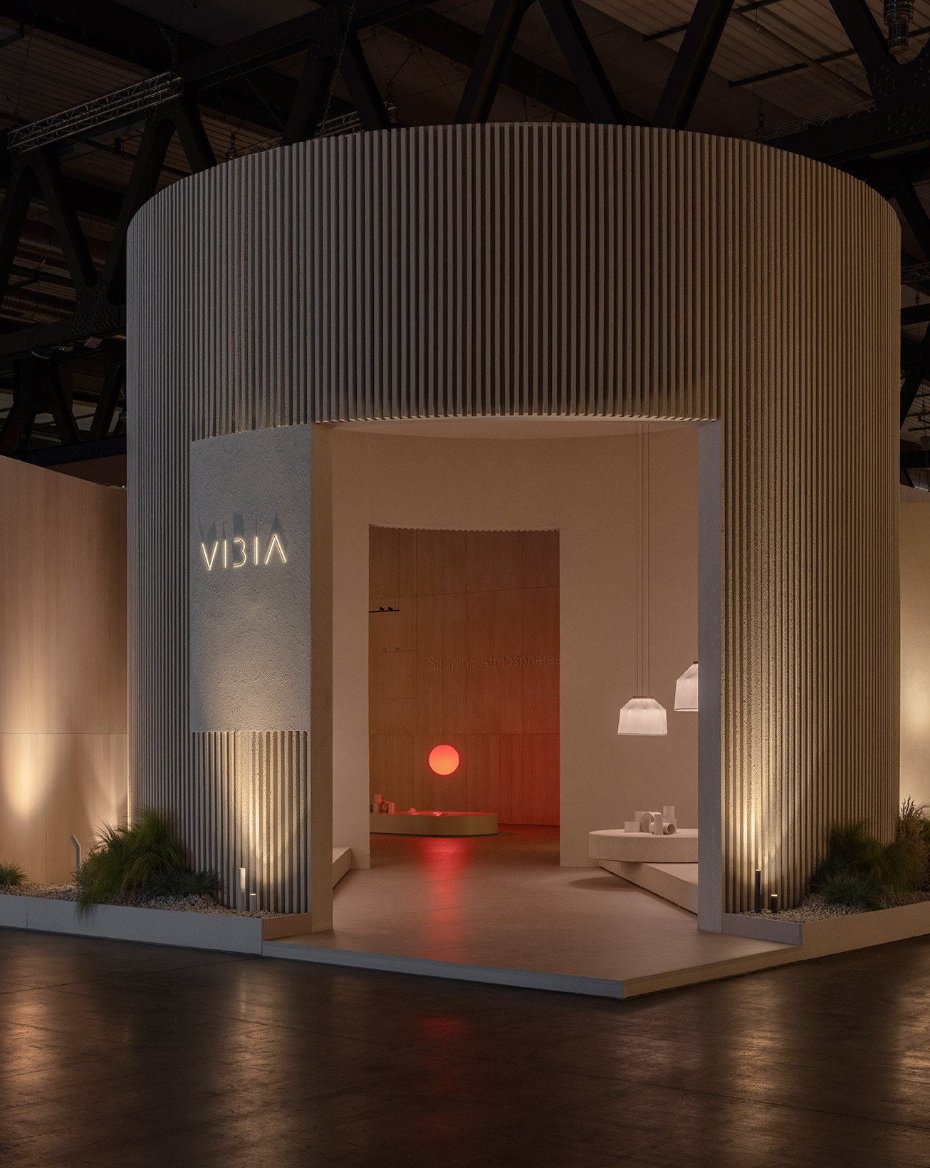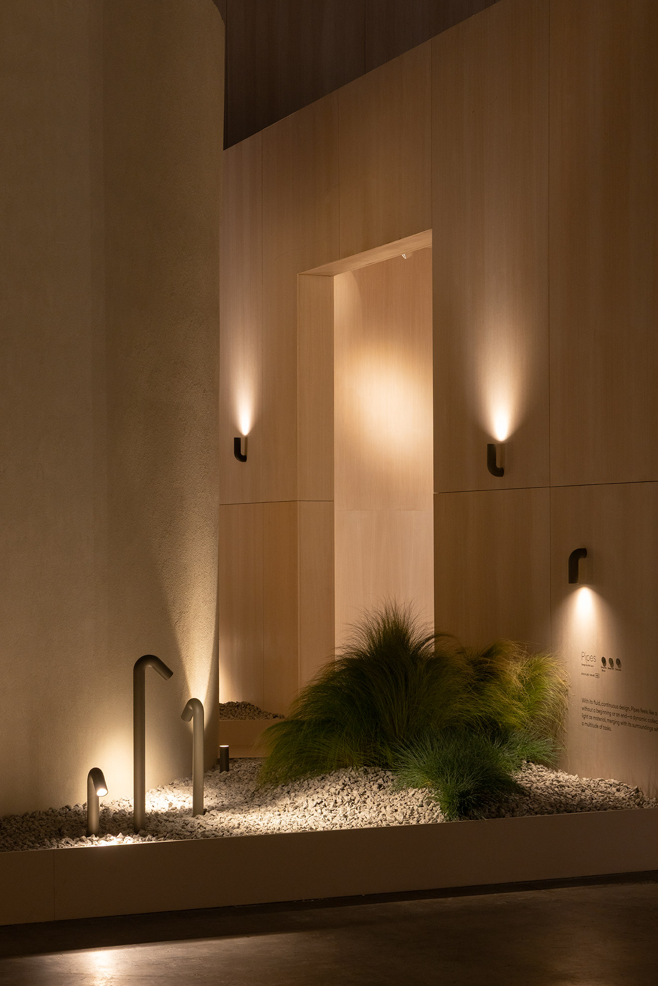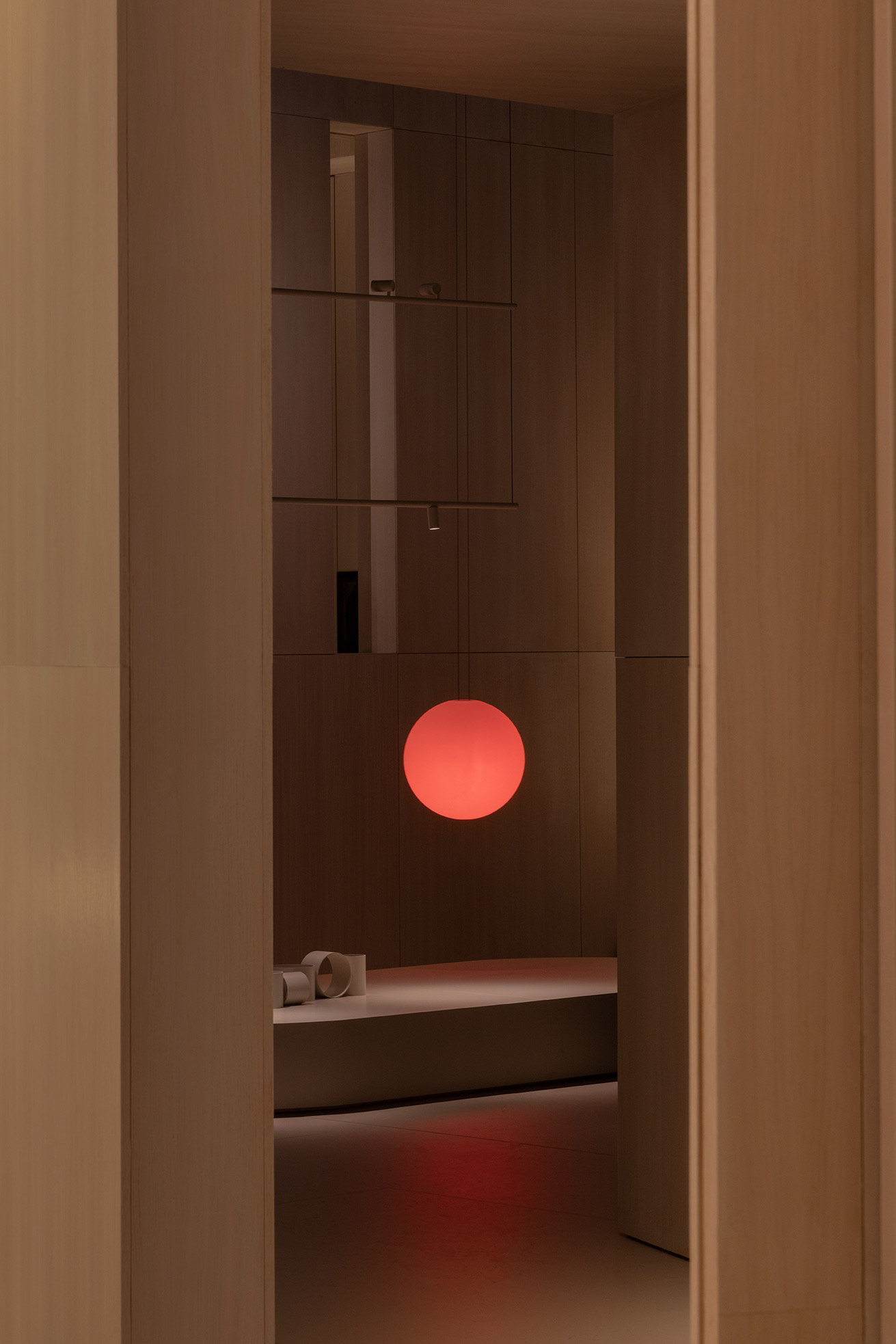 This project for Euroluce 2025 is built upon a paradox: enclosing light. From the outside, a sequence of vertical slats defines the spatial boundaries and frames a central structure — a box whose luminous skin is in constant transformation.