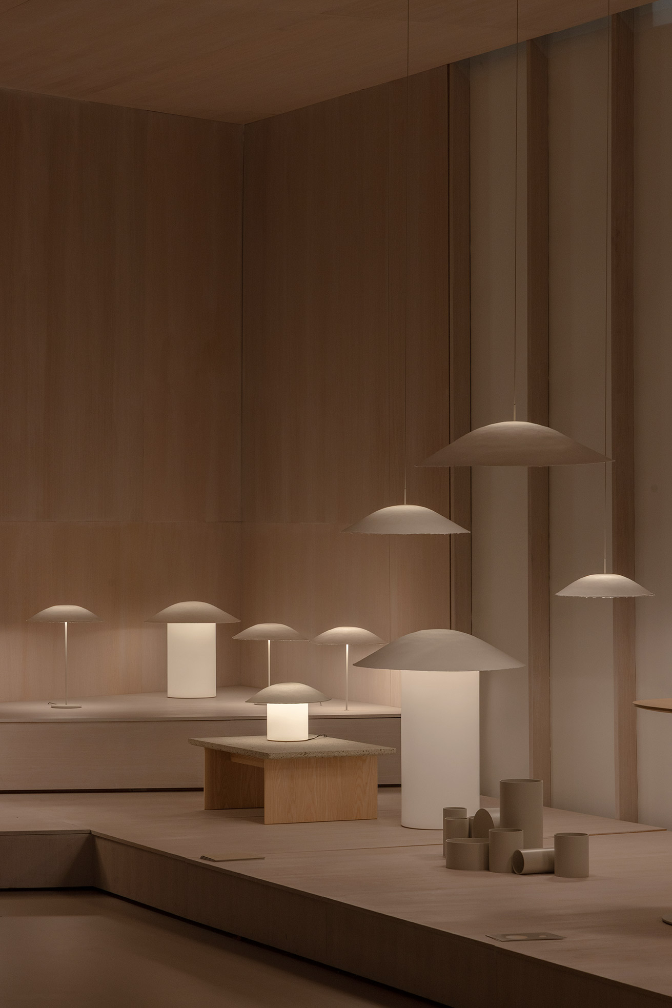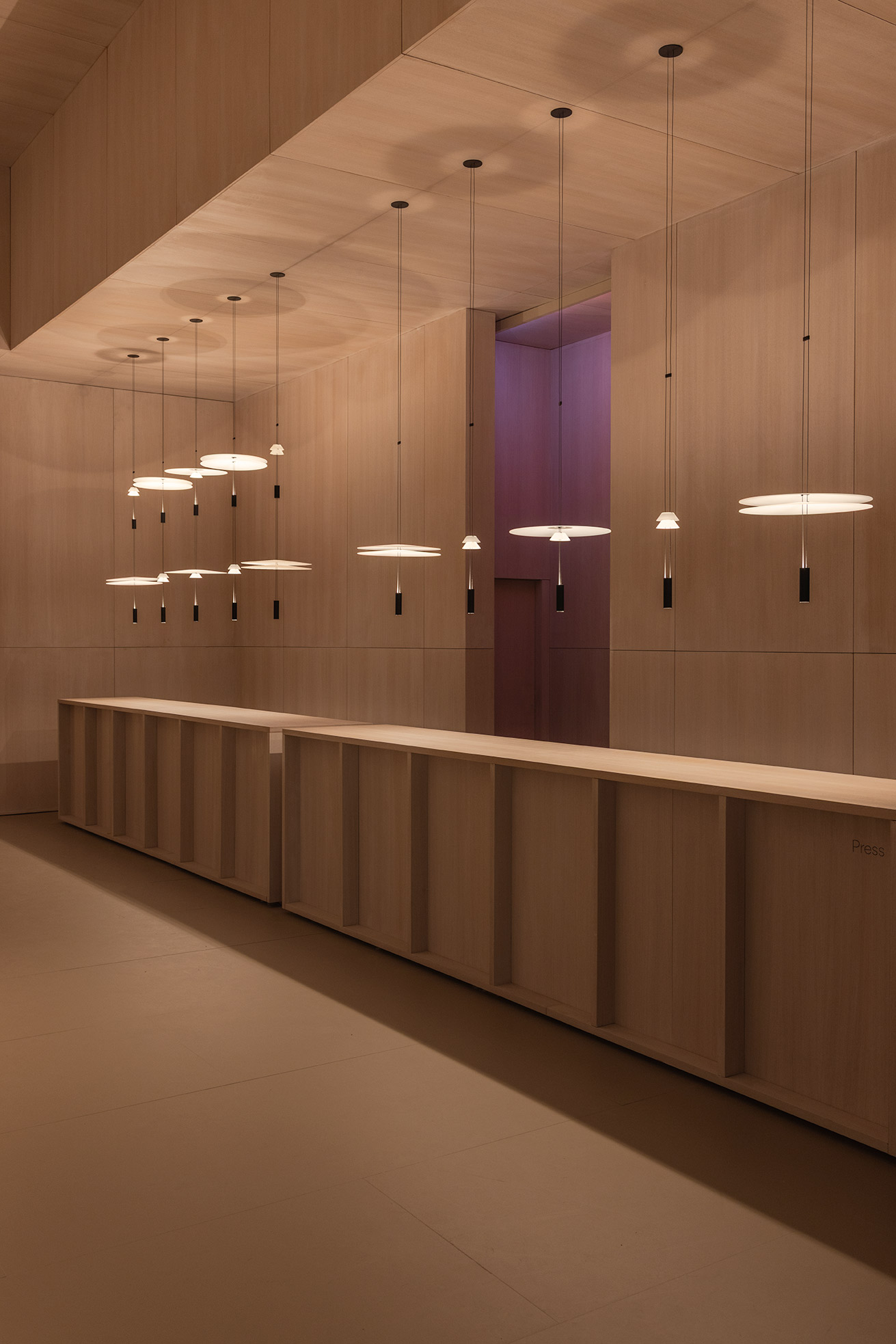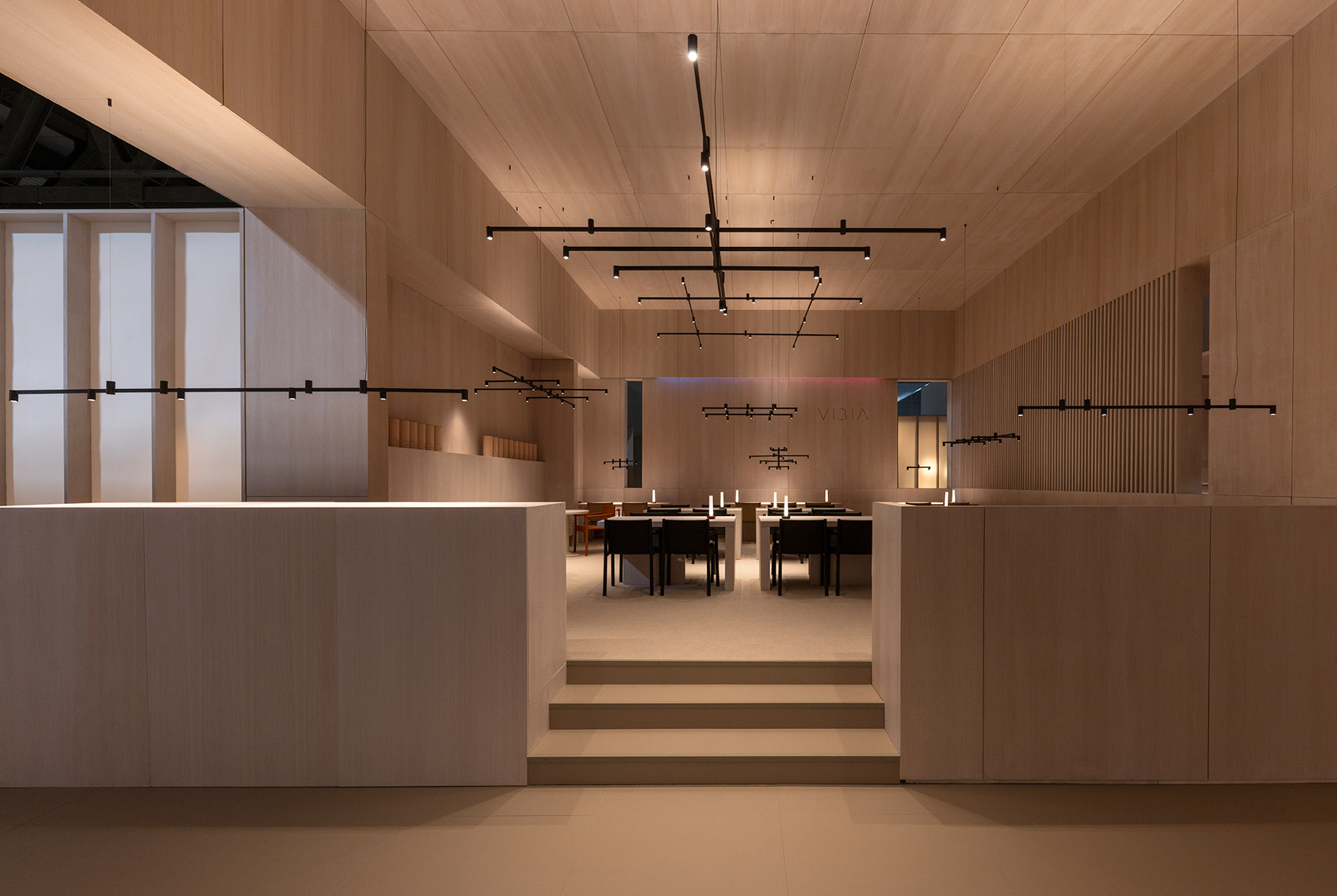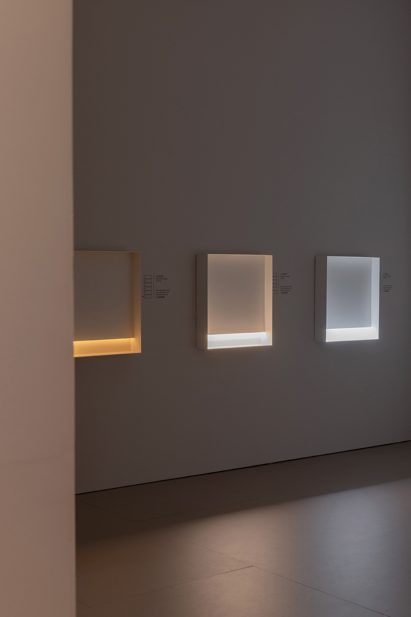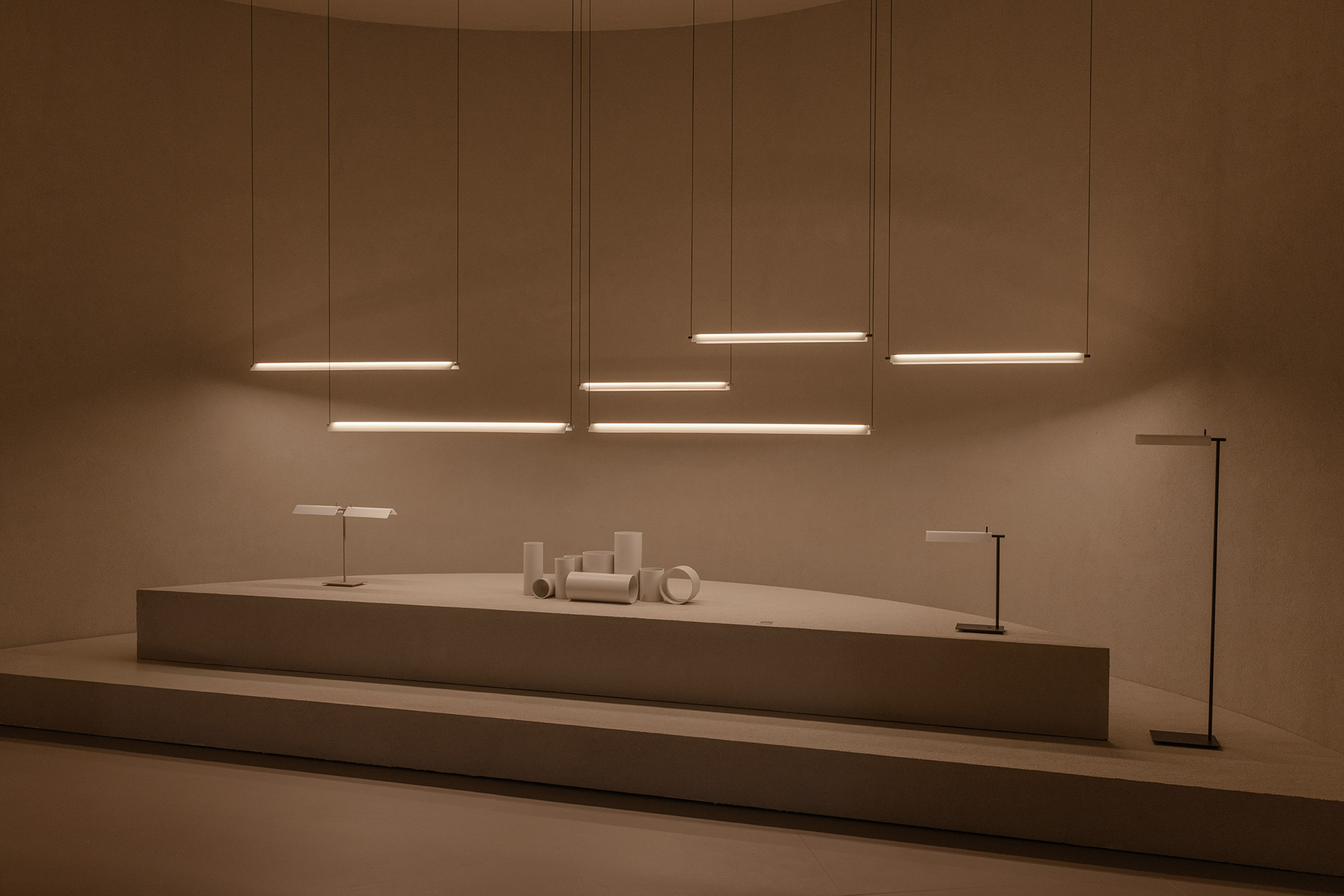 This project for Euroluce 2025 is built upon a paradox: enclosing light. From the outside, a sequence of vertical slats defines the spatial boundaries and frames a central structure — a box whose luminous skin is in constant transformation.