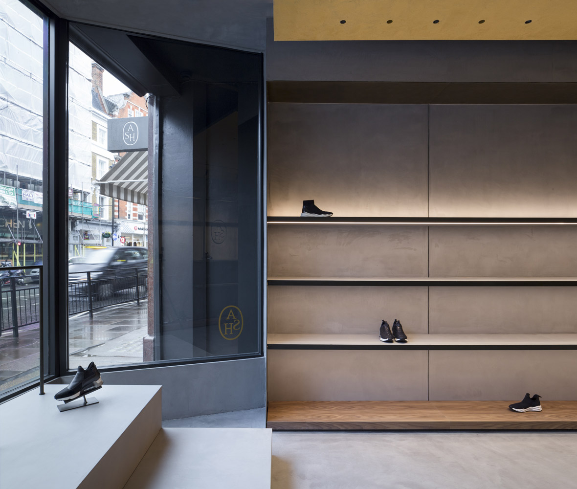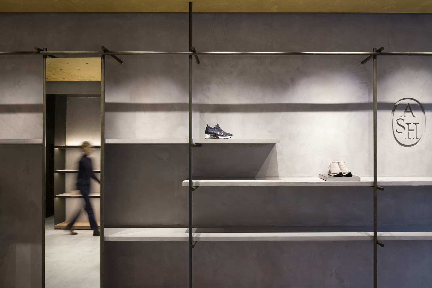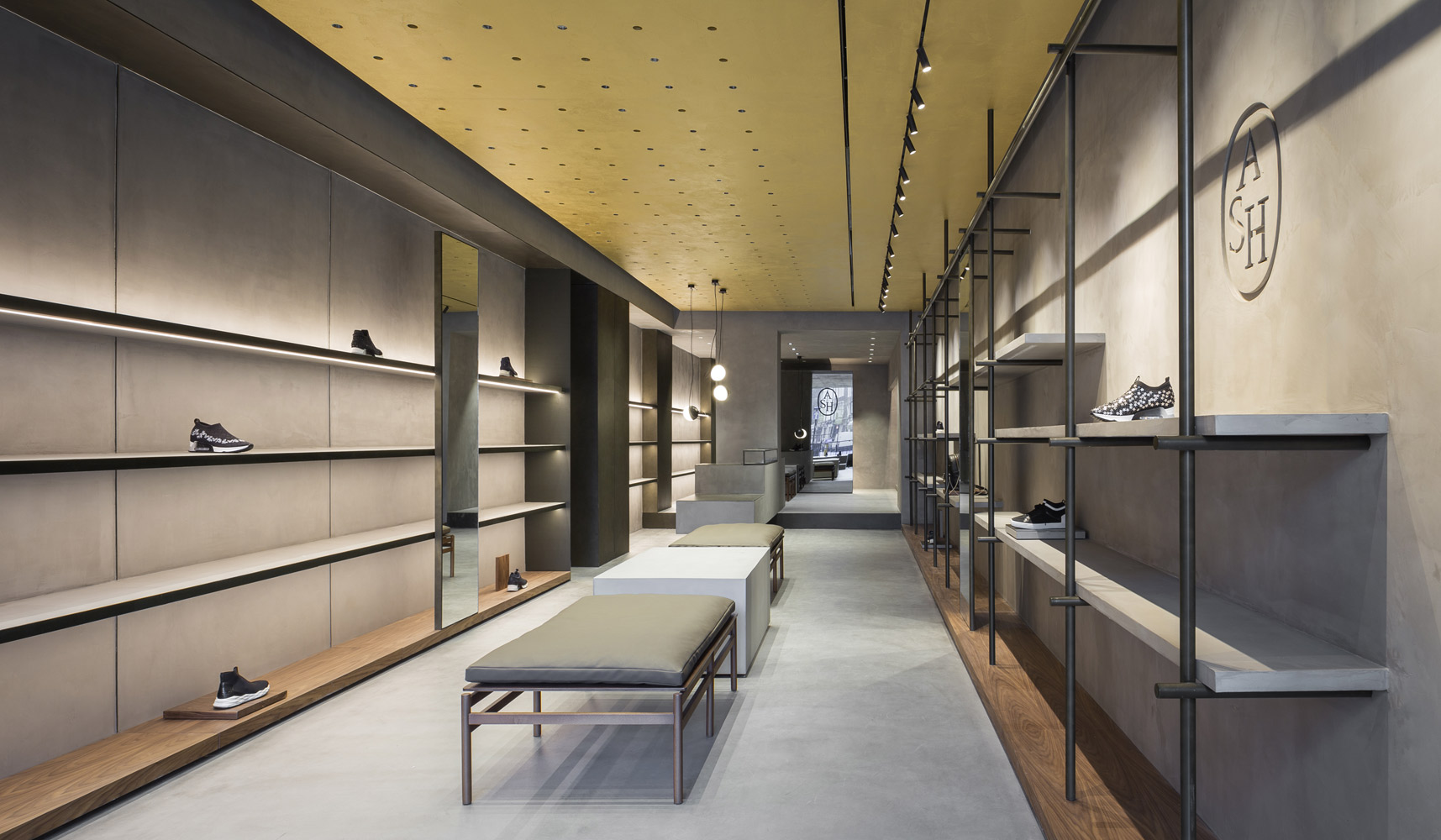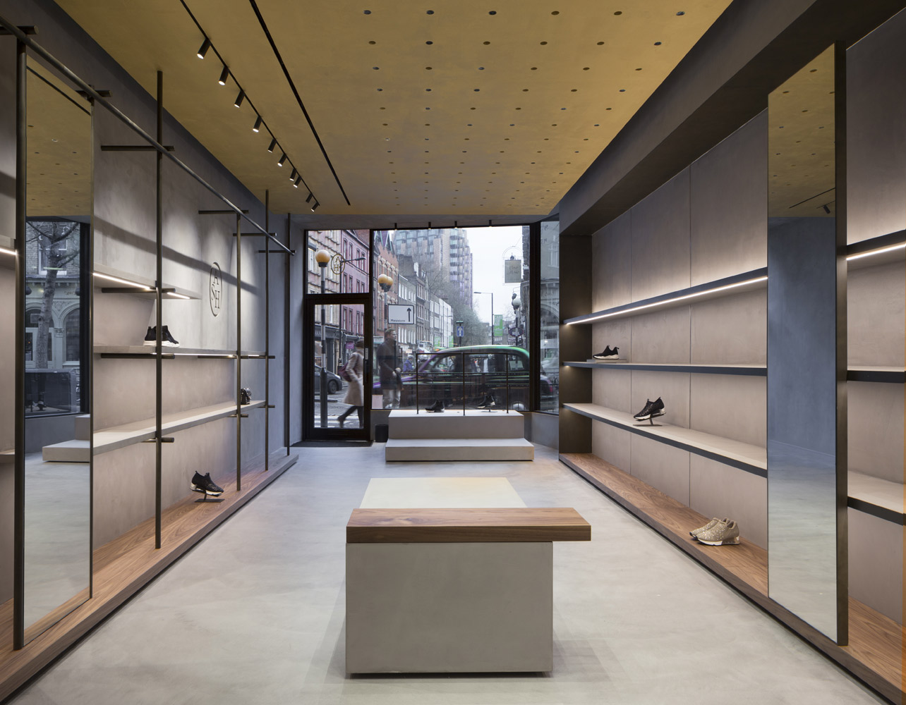 In tune with the new design concept created by Francesc Rifé Studio for the fashion and footwear brand ASH, this store located on London’s Marylebone High Street is marked by a golden ceiling and tubular metal structure that seek to enrich the simple forms of the space and its concrete neutral base.