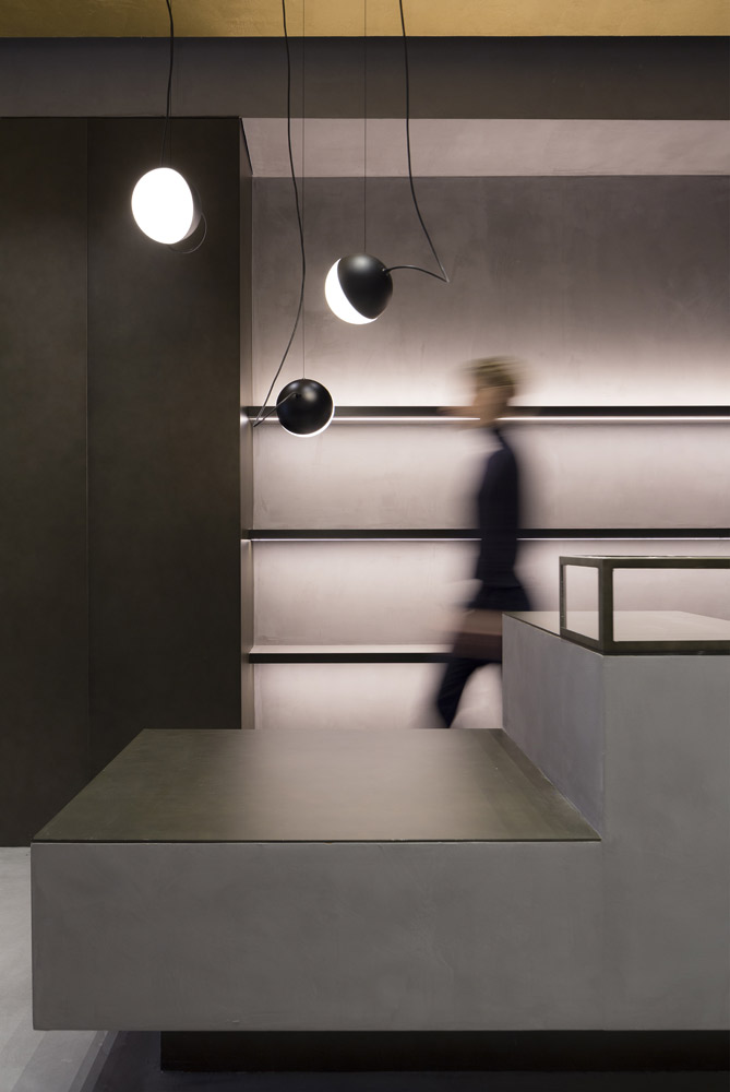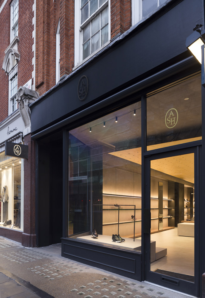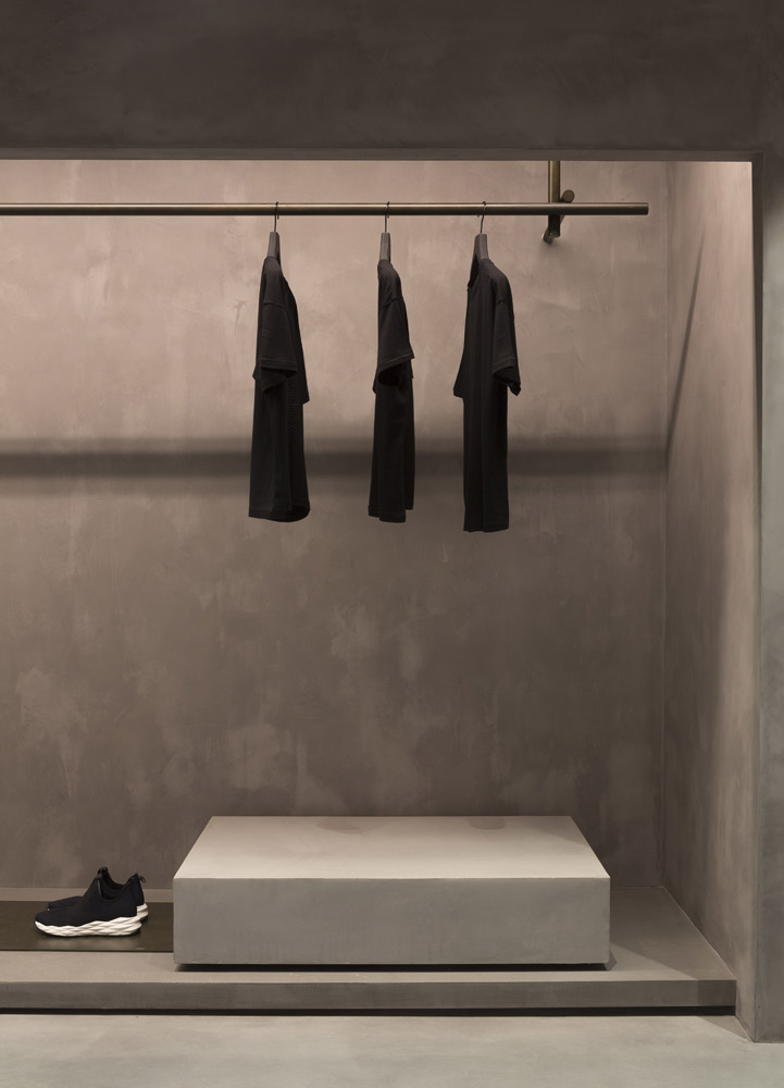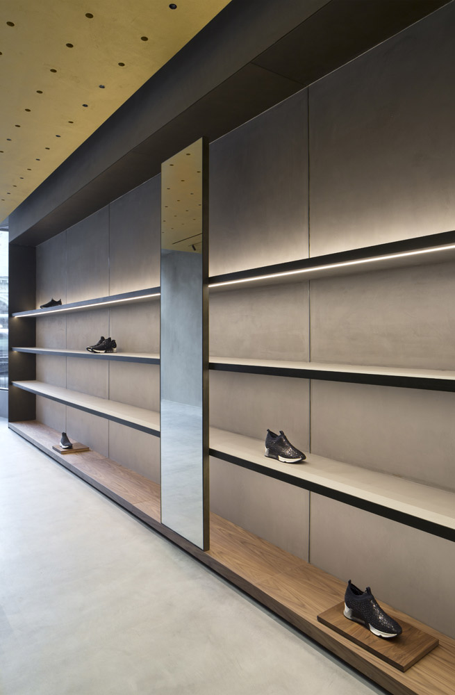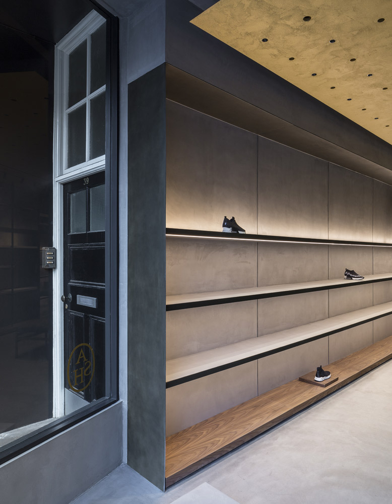 In tune with the new design concept created by Francesc Rifé Studio for the fashion and footwear brand ASH, this store located on London’s Marylebone High Street is marked by a golden ceiling and tubular metal structure that seek to enrich the simple forms of the space and its concrete neutral base.