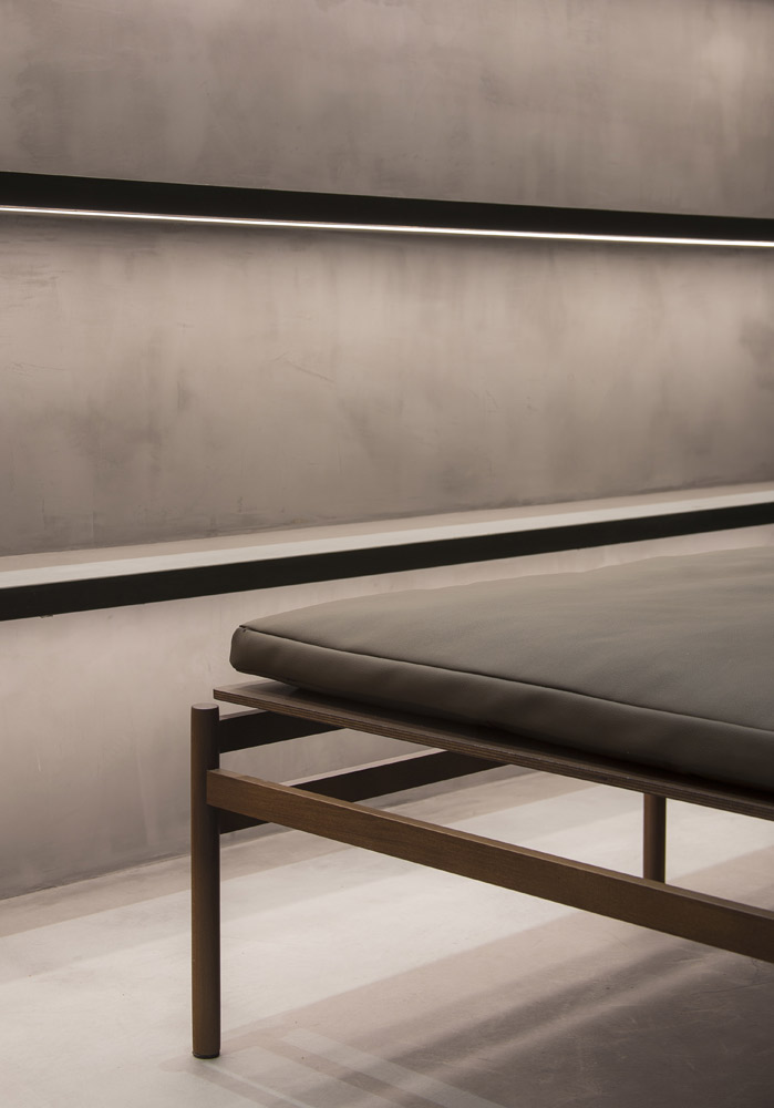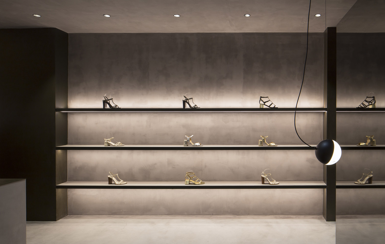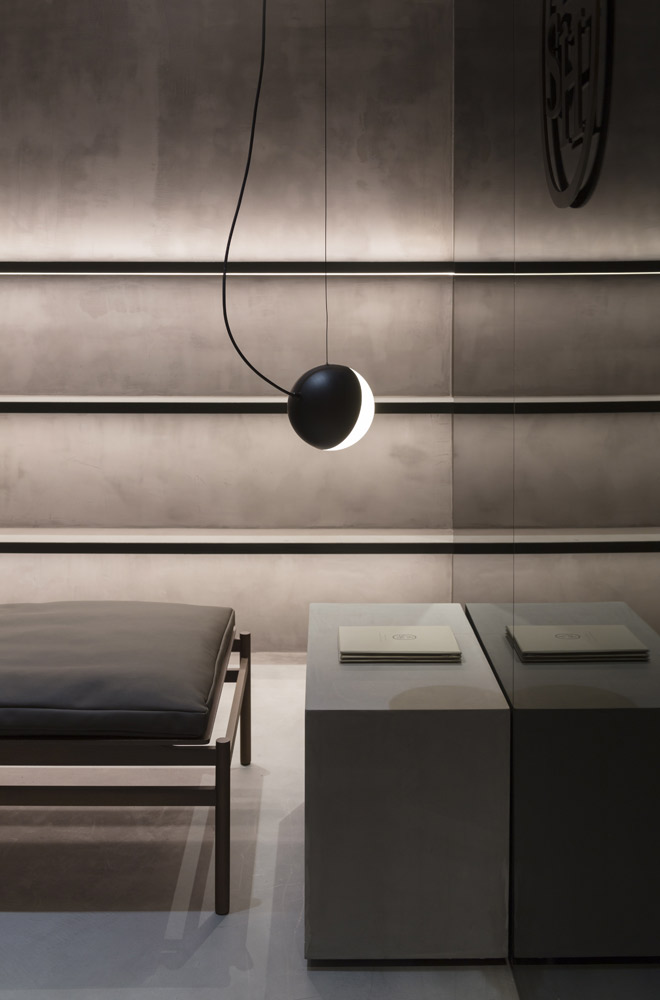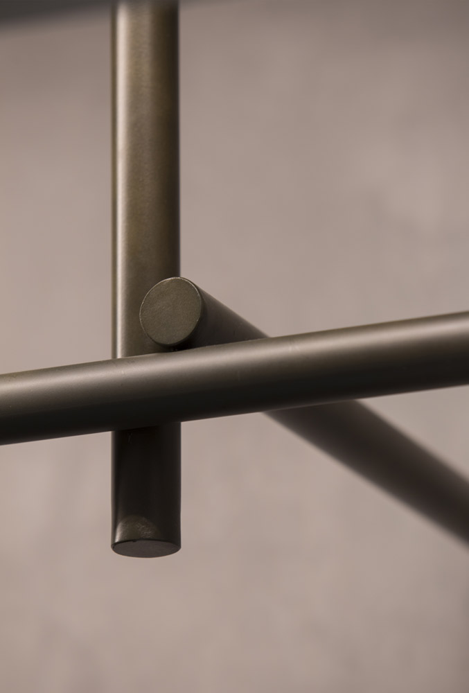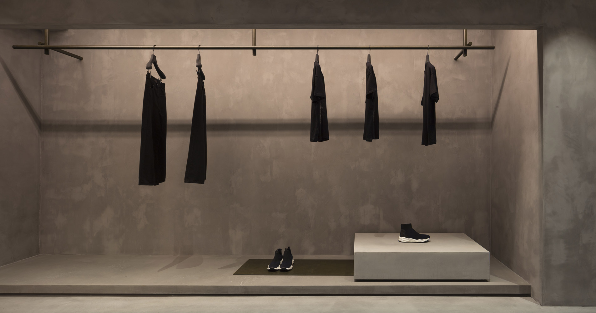 In tune with the new design concept created by Francesc Rifé Studio for the fashion and footwear brand ASH, this store located on London’s Marylebone High Street is marked by a golden ceiling and tubular metal structure that seek to enrich the simple forms of the space and its concrete neutral base.