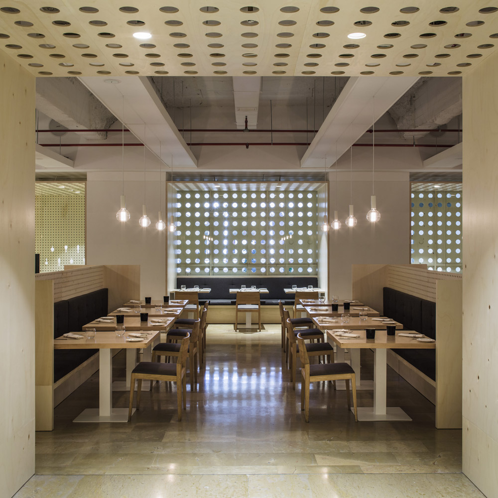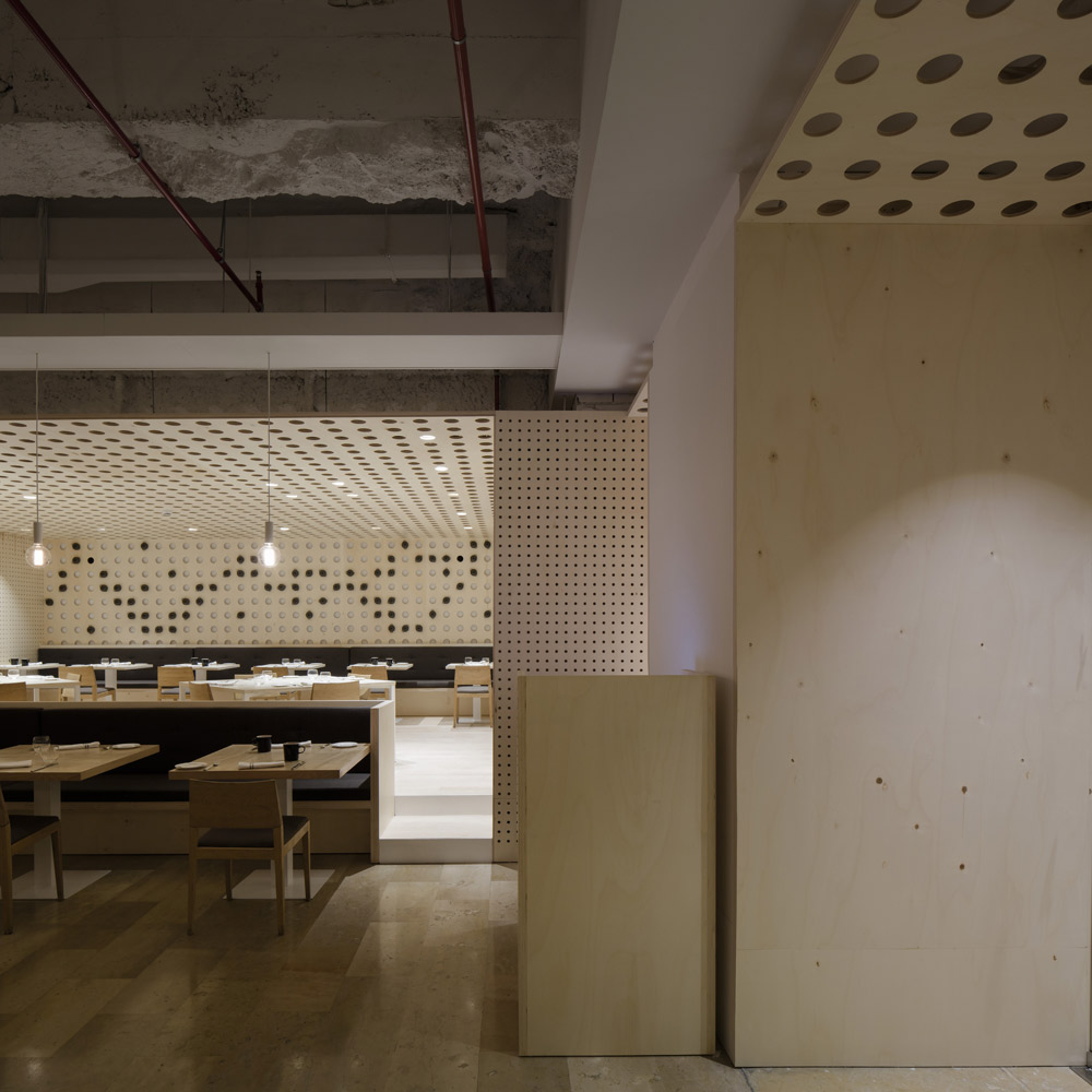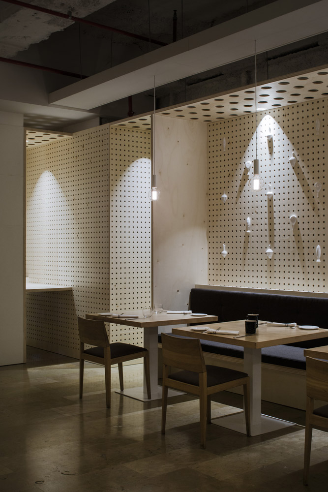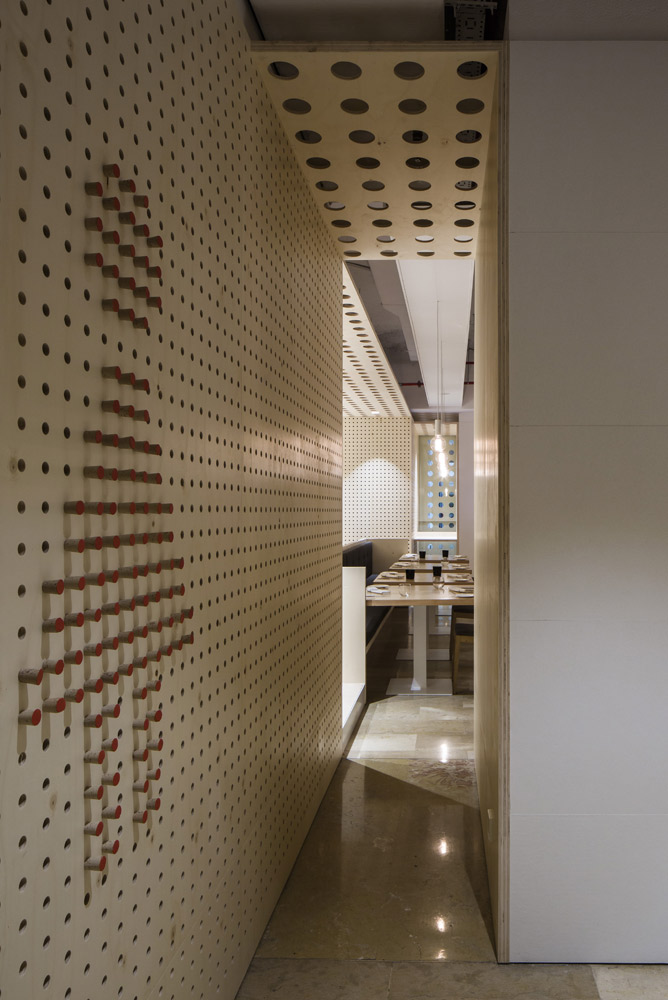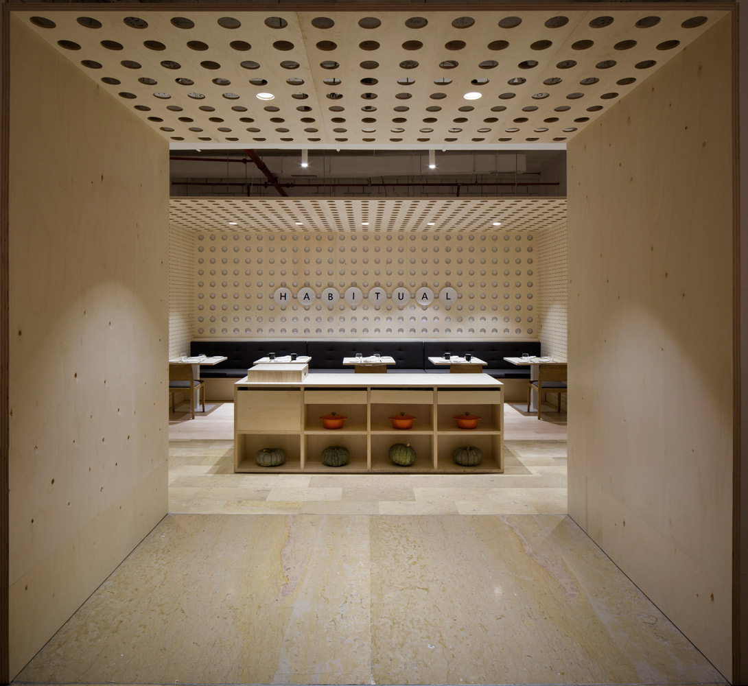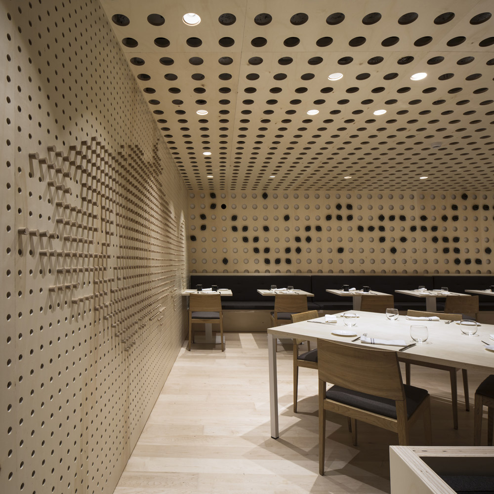 Situated in Valencia, Habitual restaurant is a project for the chef Ricard Camarena. With a surface area about 300m², poplar wood was used to perform several roles: address the issue of acoustics and add warmth to the space and create a continuous dialogue with the other features used to give it personality. The idea of drilling the wood arose from the most common motif in gastronomy: the circle (plate, glass, cup, etc.). Using this and Le Creuset Cookware, we managed to create geometric clarity and identity.