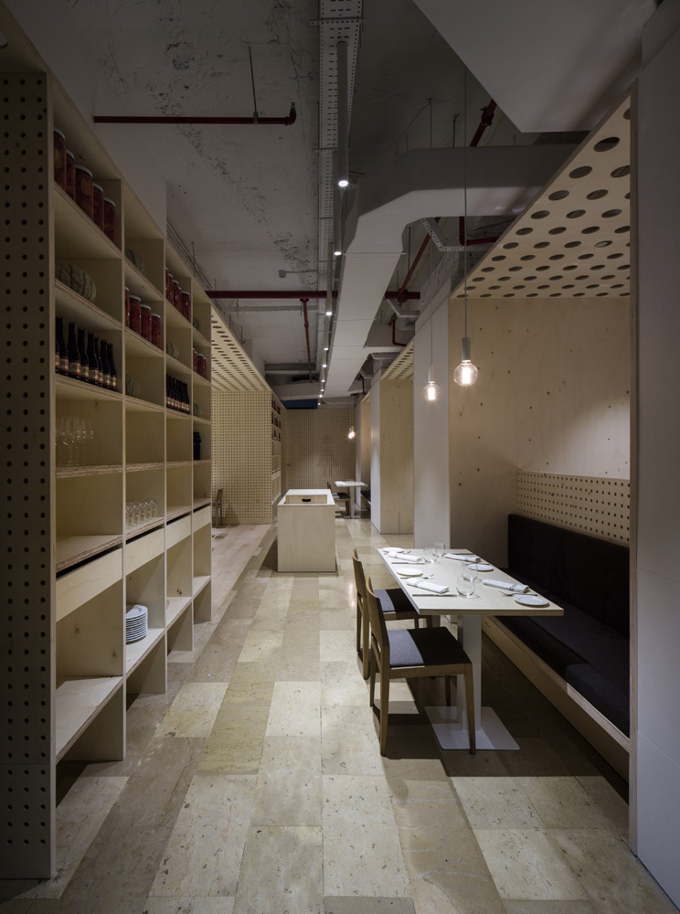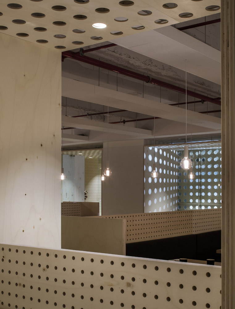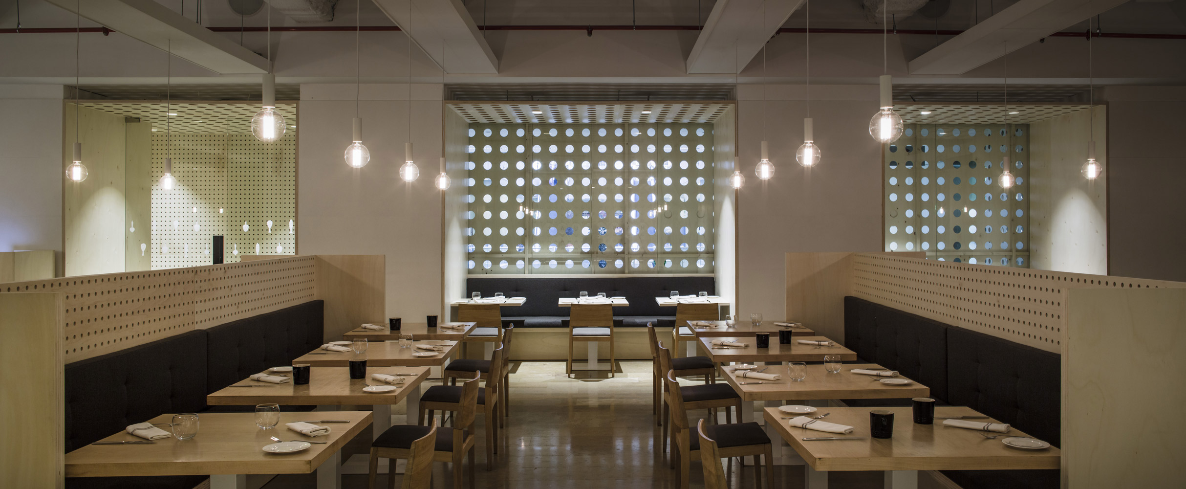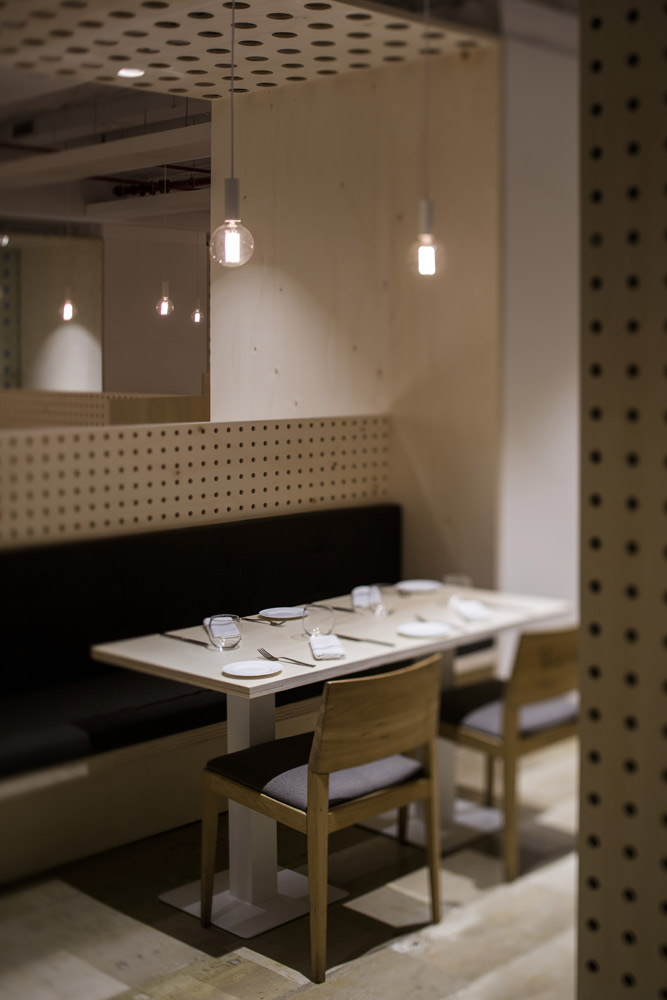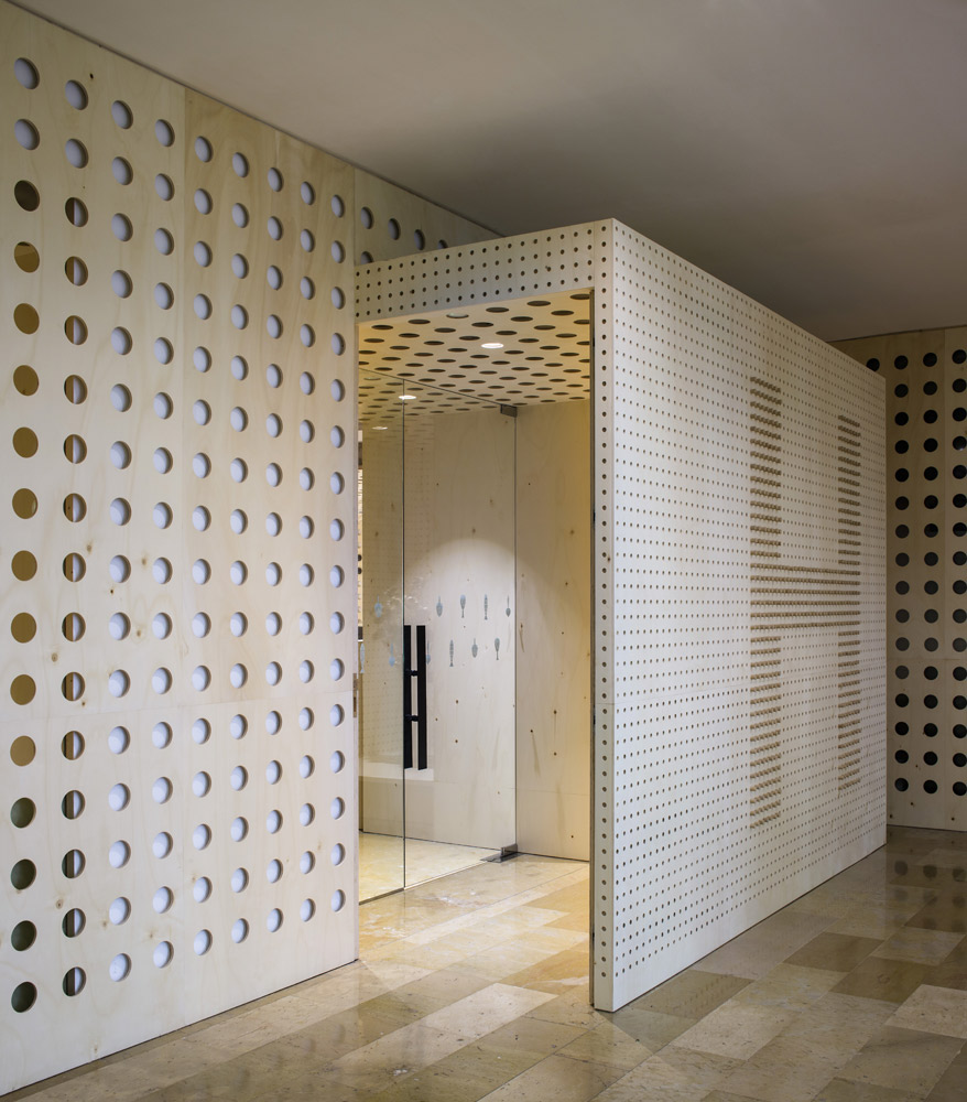 Situated in Valencia, Habitual restaurant is a project for the chef Ricard Camarena. With a surface area about 300m², poplar wood was used to perform several roles: address the issue of acoustics and add warmth to the space and create a continuous dialogue with the other features used to give it personality. The idea of drilling the wood arose from the most common motif in gastronomy: the circle (plate, glass, cup, etc.). Using this and Le Creuset Cookware, we managed to create geometric clarity and identity.