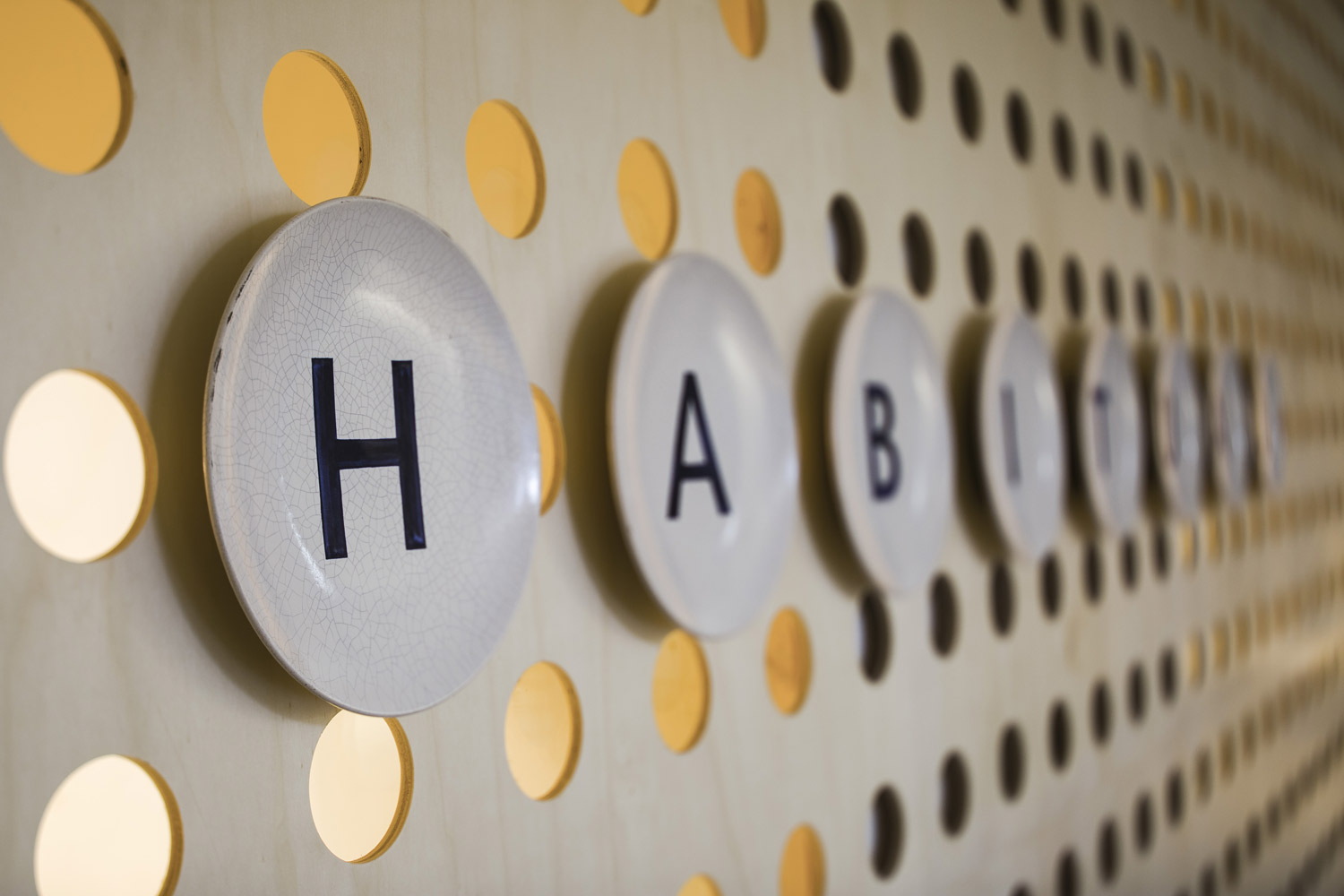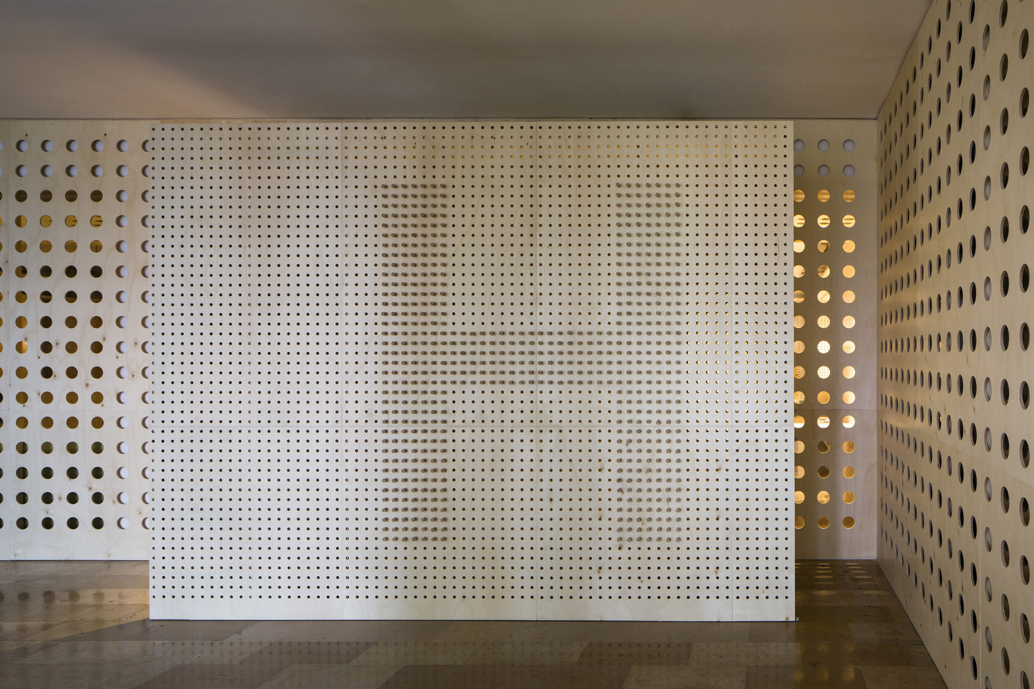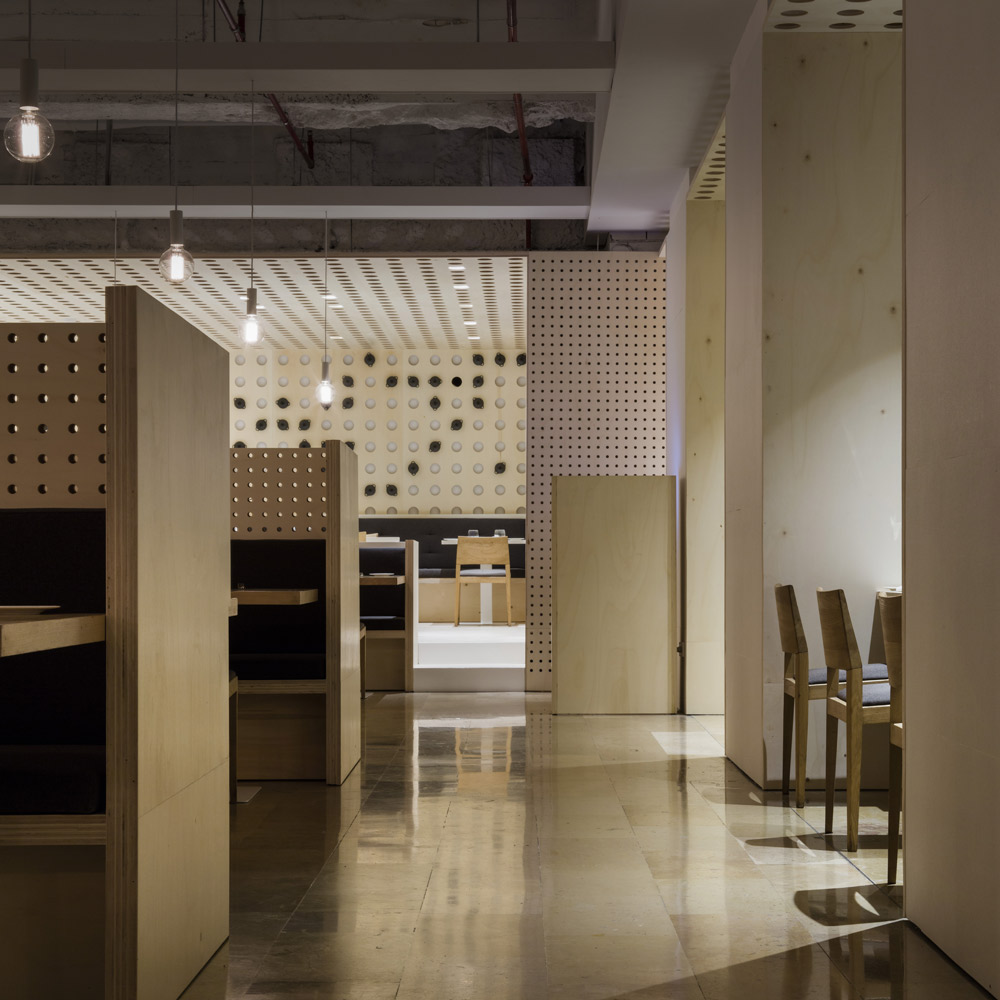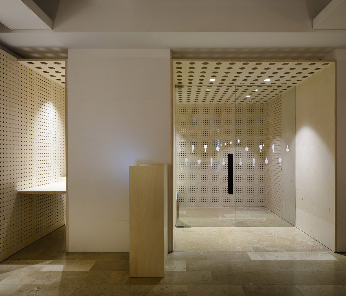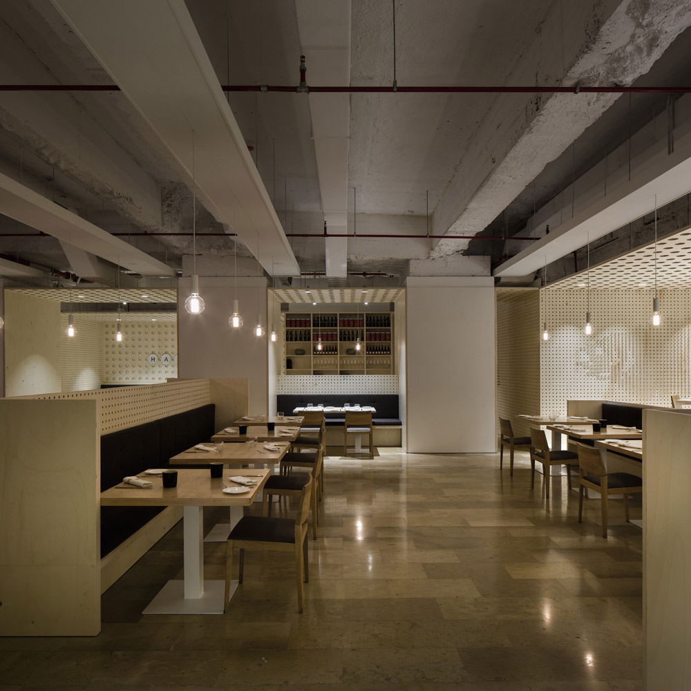 Situated in Valencia, Habitual restaurant is a project for the chef Ricard Camarena. With a surface area about 300m², poplar wood was used to perform several roles: address the issue of acoustics and add warmth to the space and create a continuous dialogue with the other features used to give it personality. The idea of drilling the wood arose from the most common motif in gastronomy: the circle (plate, glass, cup, etc.). Using this and Le Creuset Cookware, we managed to create geometric clarity and identity.