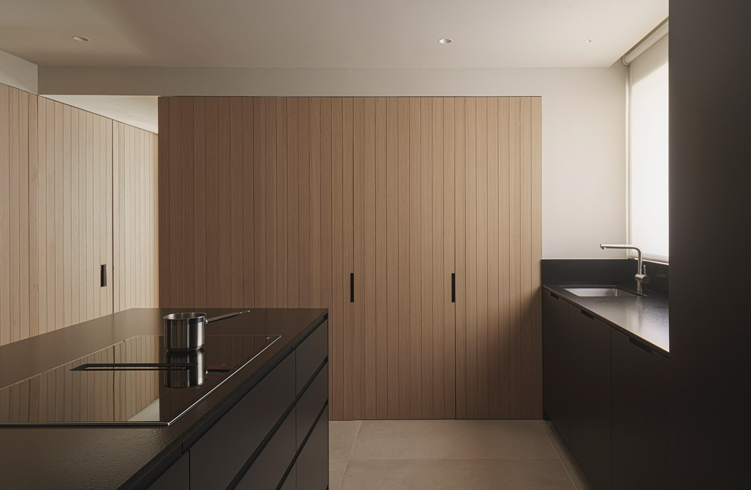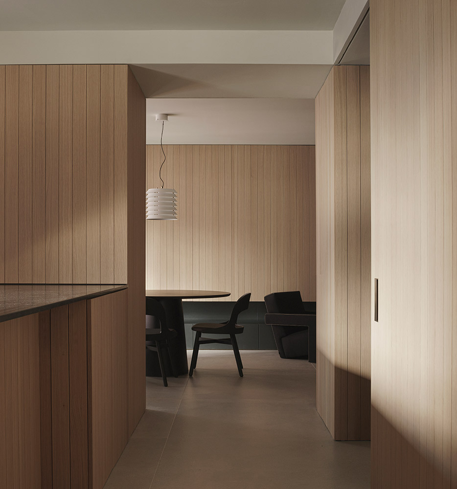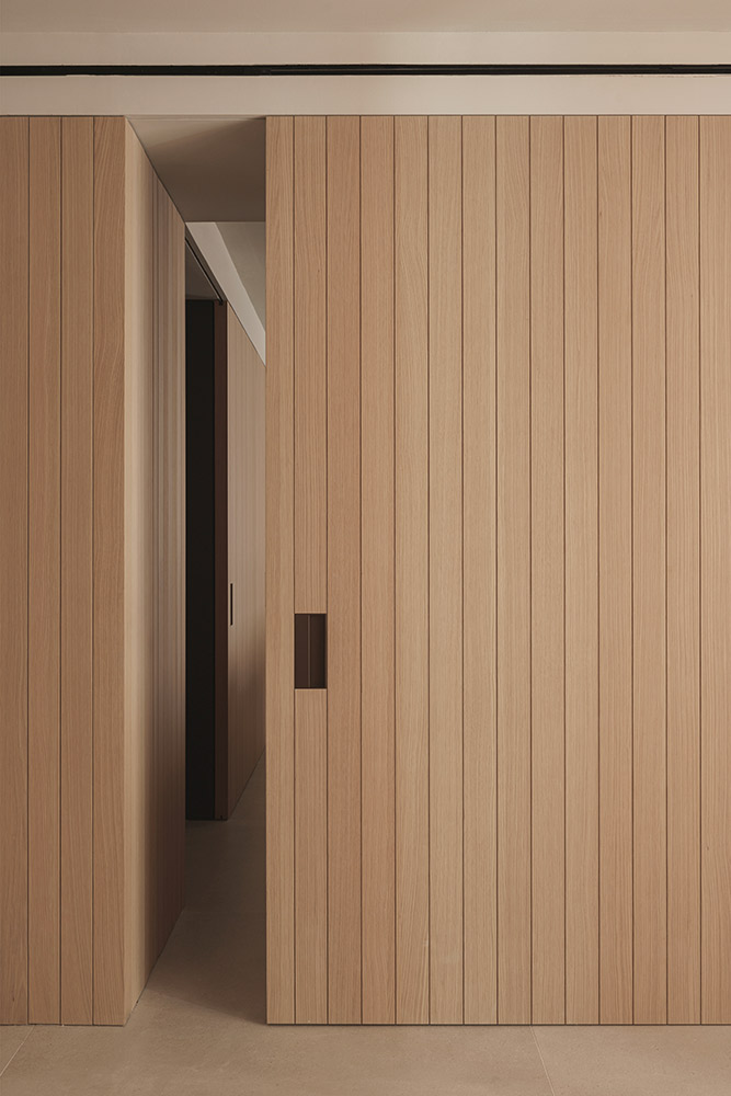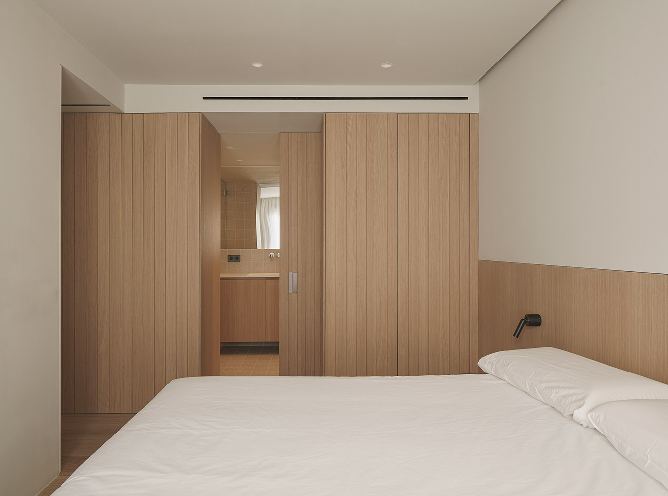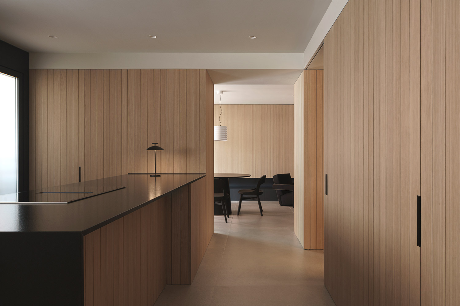 Interior design is a material art in which the tactile sense becomes as essential as space organization. In this new small apartment in Valencia, the oak wood slats were used as a sensitive and functional tool to achieve warmth and integration.