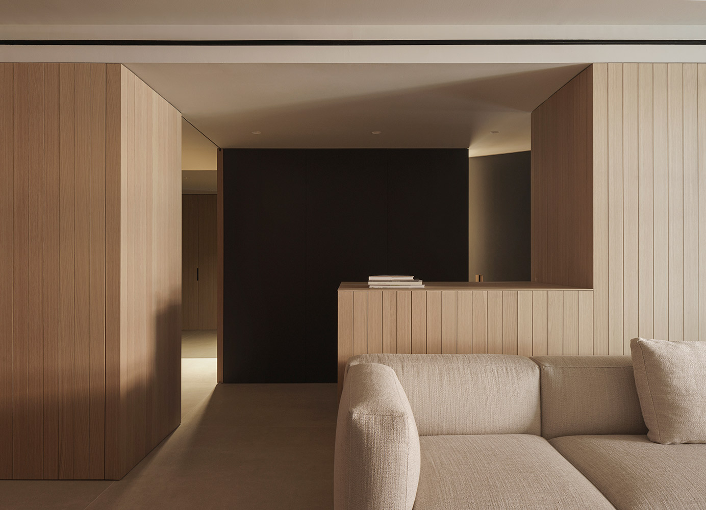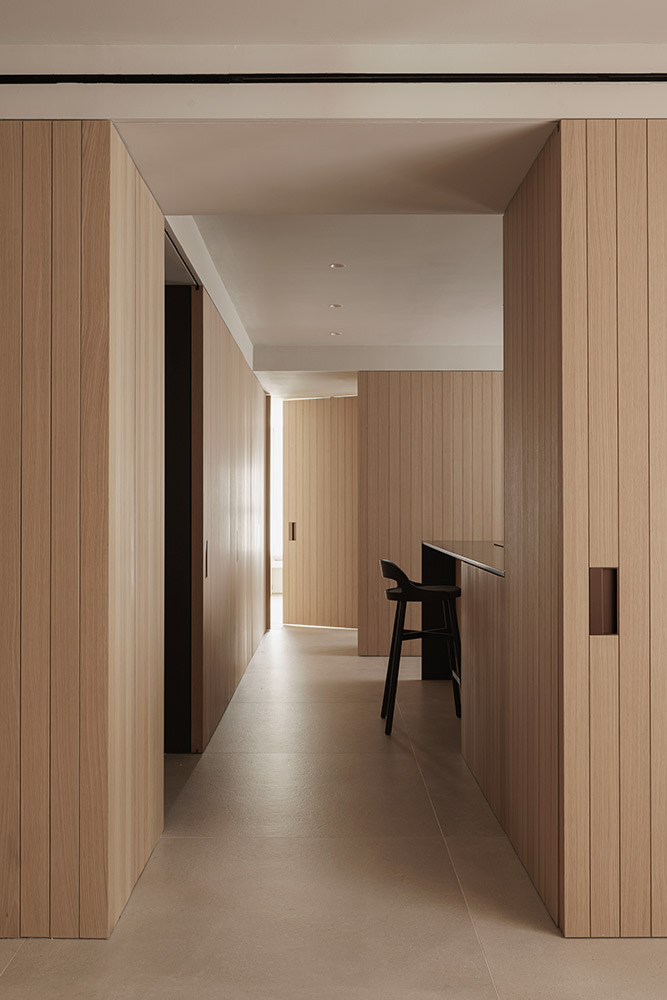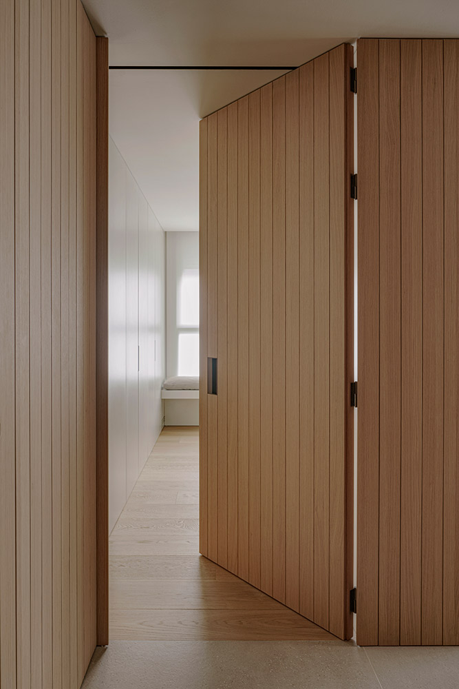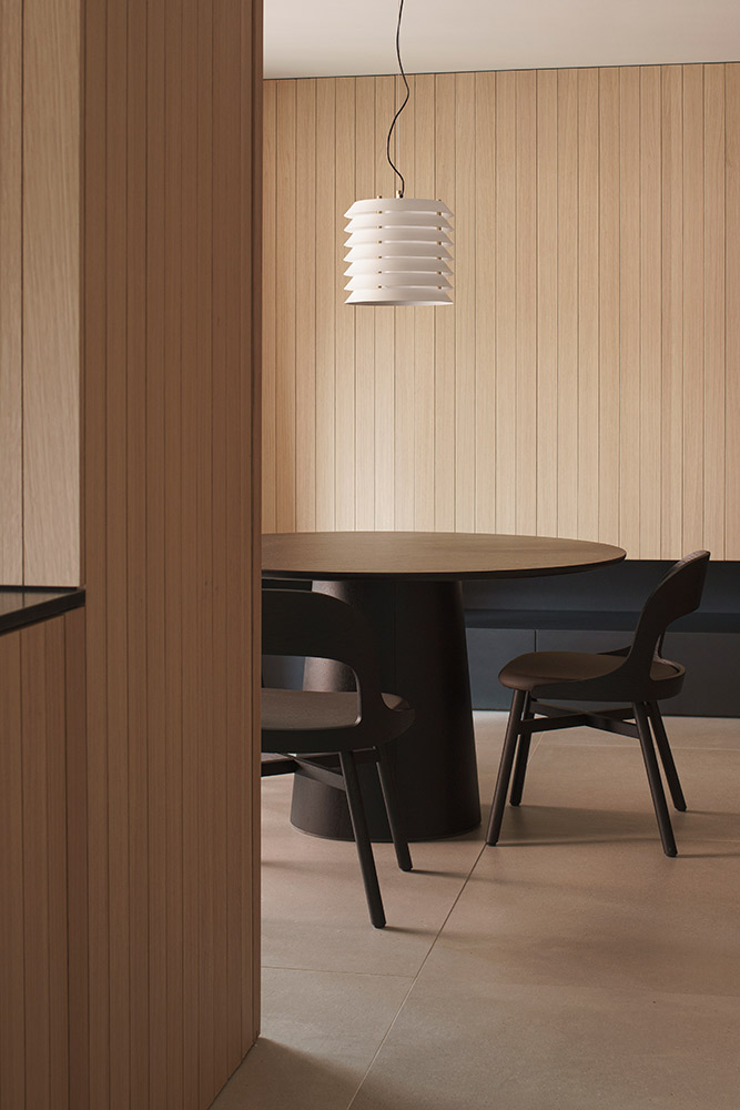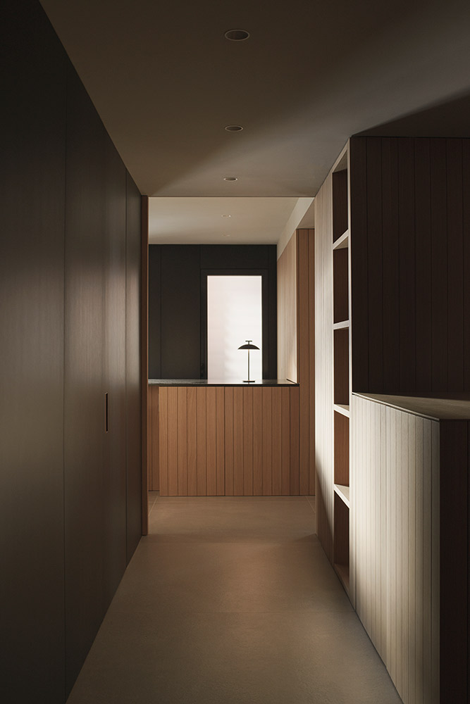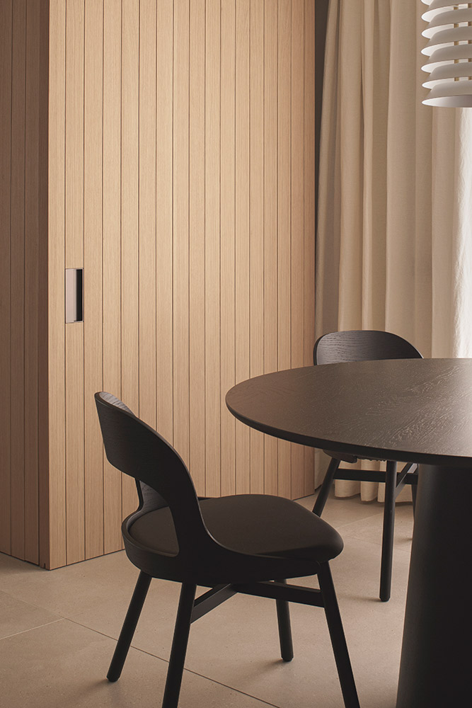 Interior design is a material art in which the tactile sense becomes as essential as space organization. In this new small apartment in Valencia, the oak wood slats were used as a sensitive and functional tool to achieve warmth and integration.