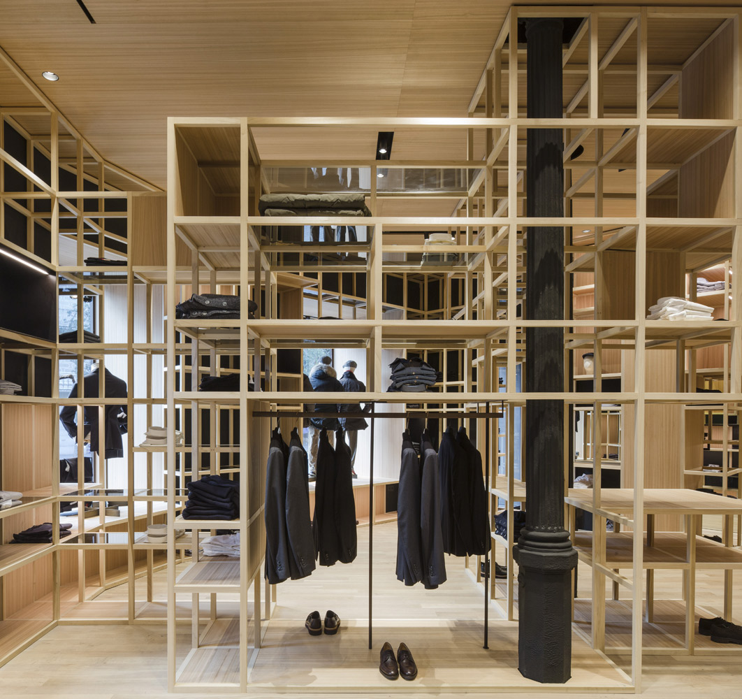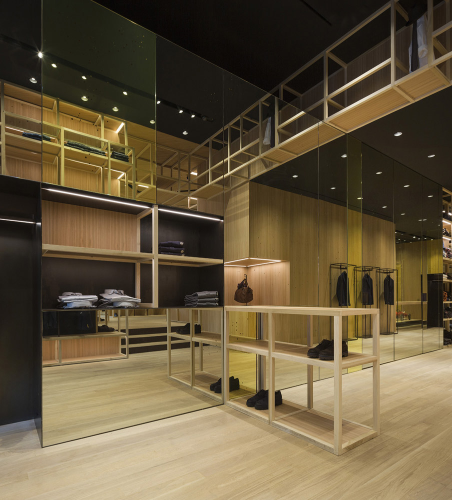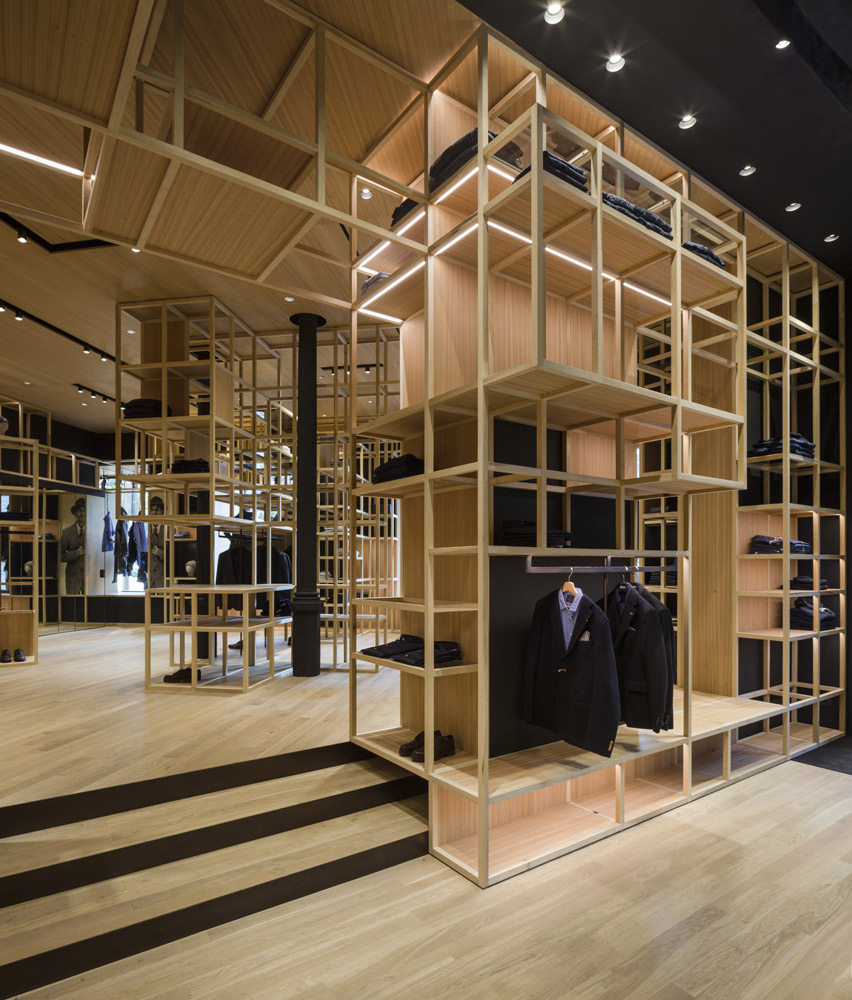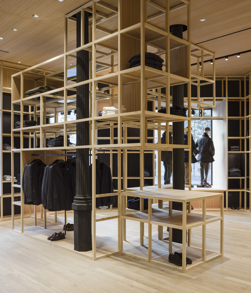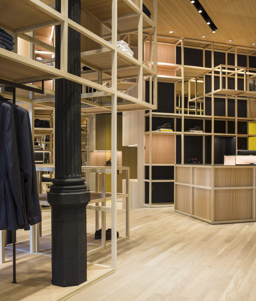 The store’s set up recalls the shelving of the former Colmado Quílez: the grocery occupying these premises from the ‘40s onwards. An image enhanced by the mesh with which the studio has decided to dress up the space, and which in turn acts as shelving for arranging clothing.