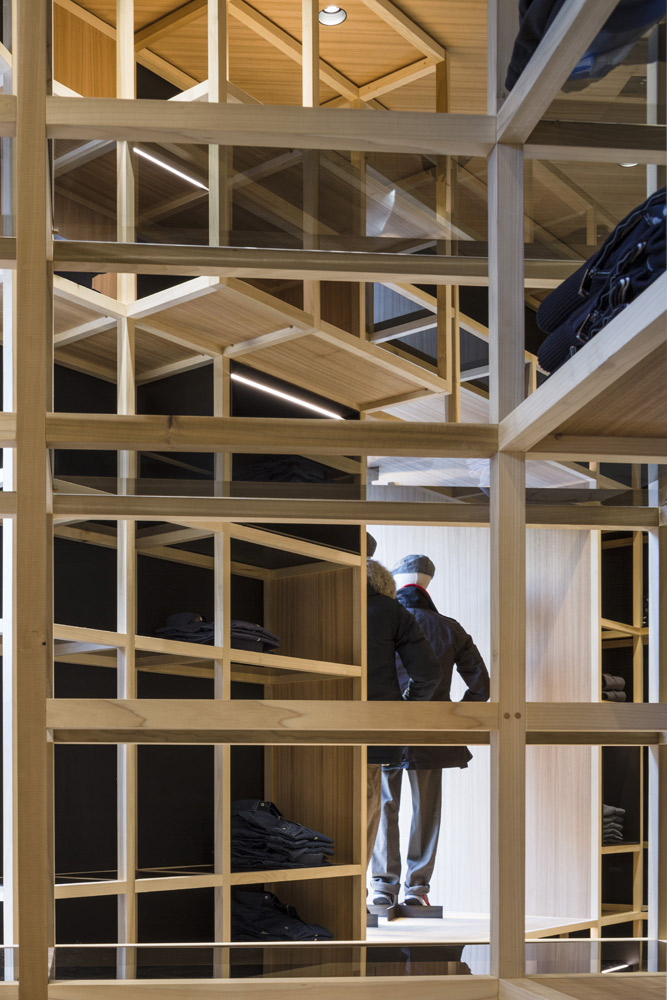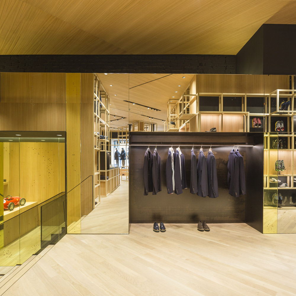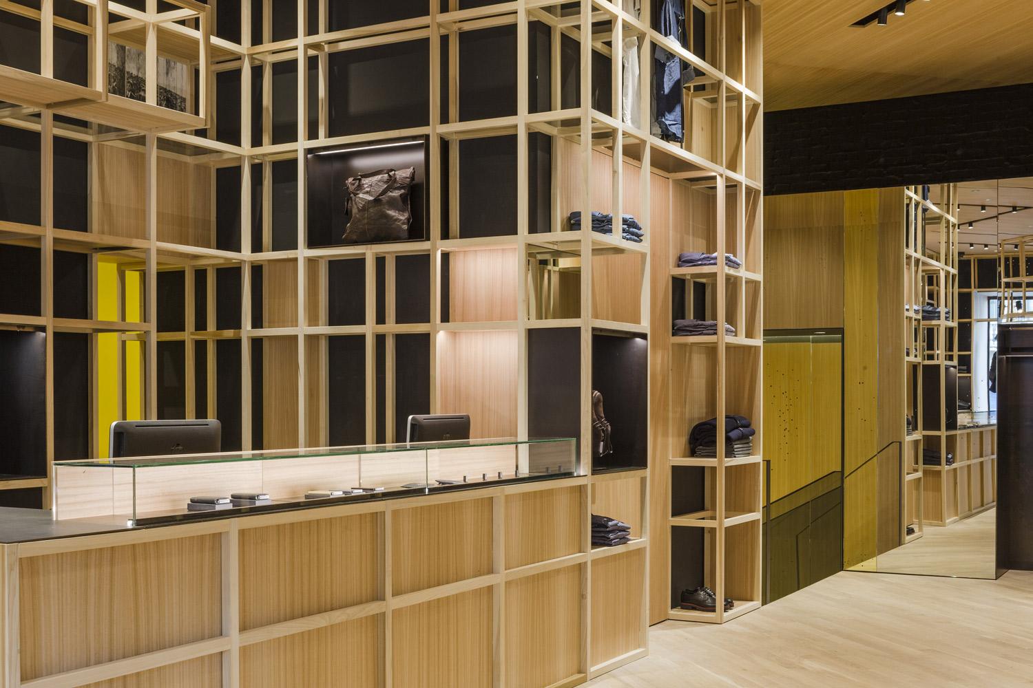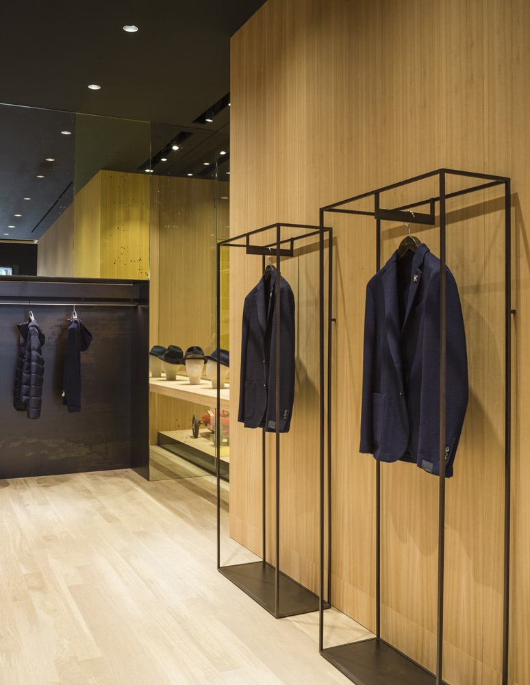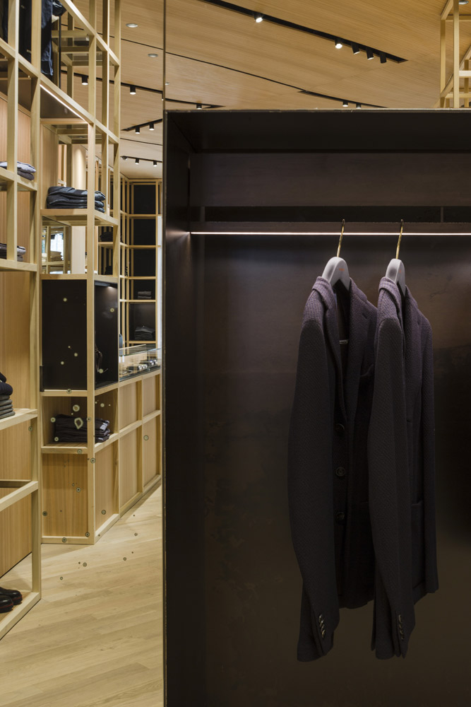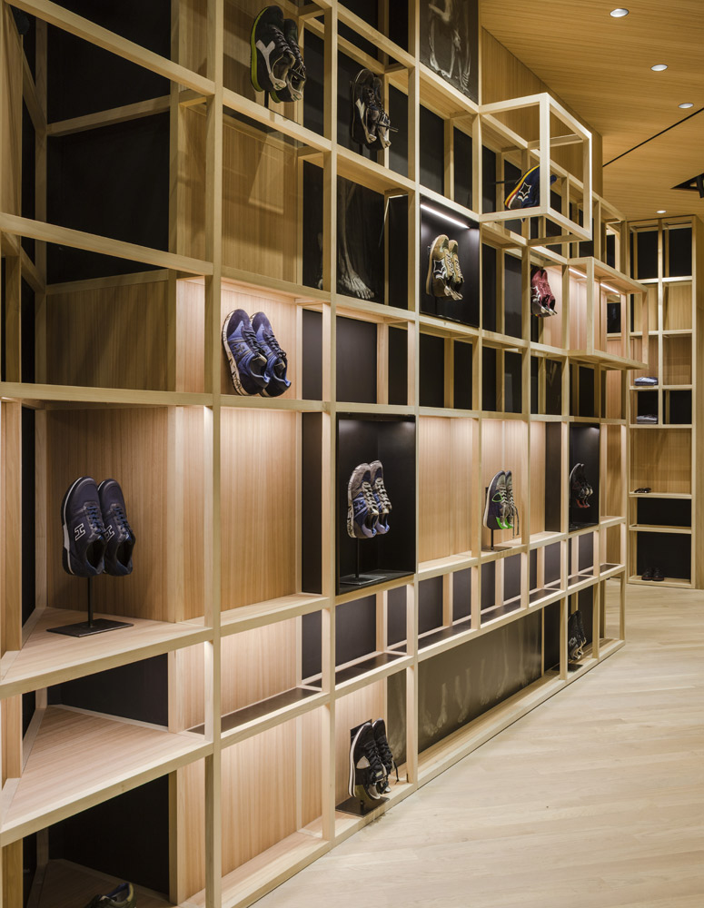 The store’s set up recalls the shelving of the former Colmado Quílez: the grocery occupying these premises from the ‘40s onwards. An image enhanced by the mesh with which the studio has decided to dress up the space, and which in turn acts as shelving for arranging clothing.