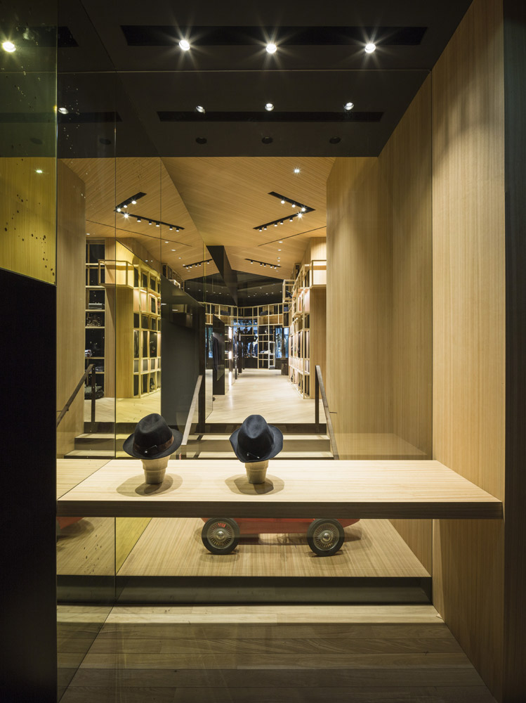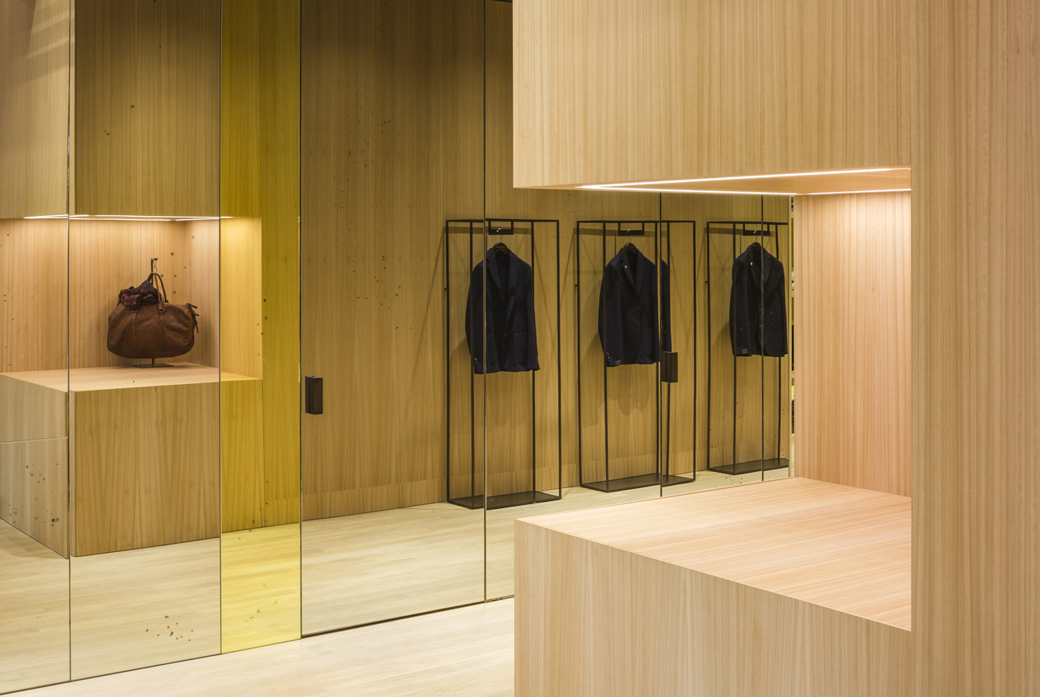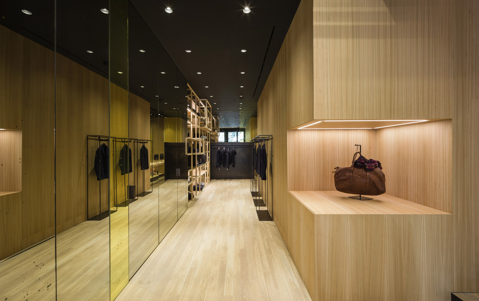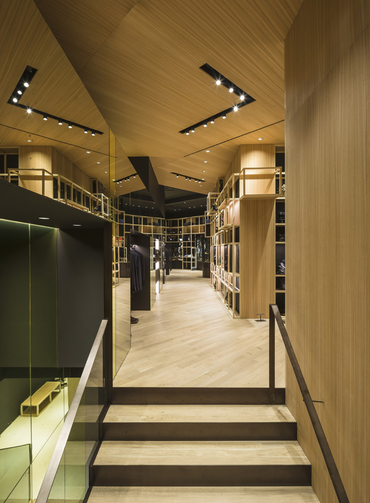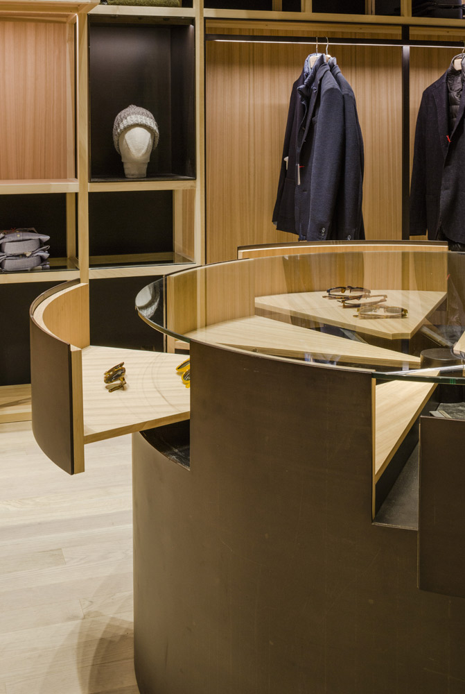 The store’s set up recalls the shelving of the former Colmado Quílez: the grocery occupying these premises from the ‘40s onwards. An image enhanced by the mesh with which the studio has decided to dress up the space, and which in turn acts as shelving for arranging clothing.