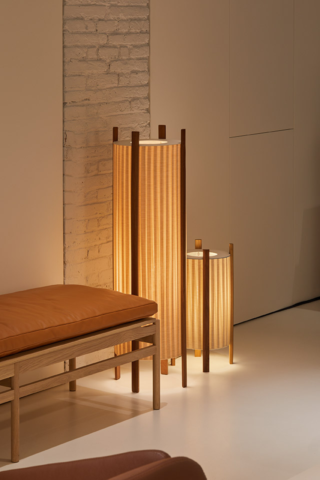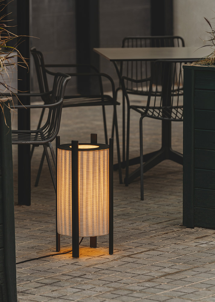 Projected as a cylinder, this new lamp designed for Milan is built essentially through ribbons that wrap around the light while a flat metal disk partially covers the upper part, keeping it hidden. The four wooden legs that lift and support the body share a flat rounded shape that contributes to its simplicity and overall lightweight feel. The finish on the legs, available in natural or lacquered wood, defines the final identity of the piece. A design made from materials that are also suitable for outdoors.