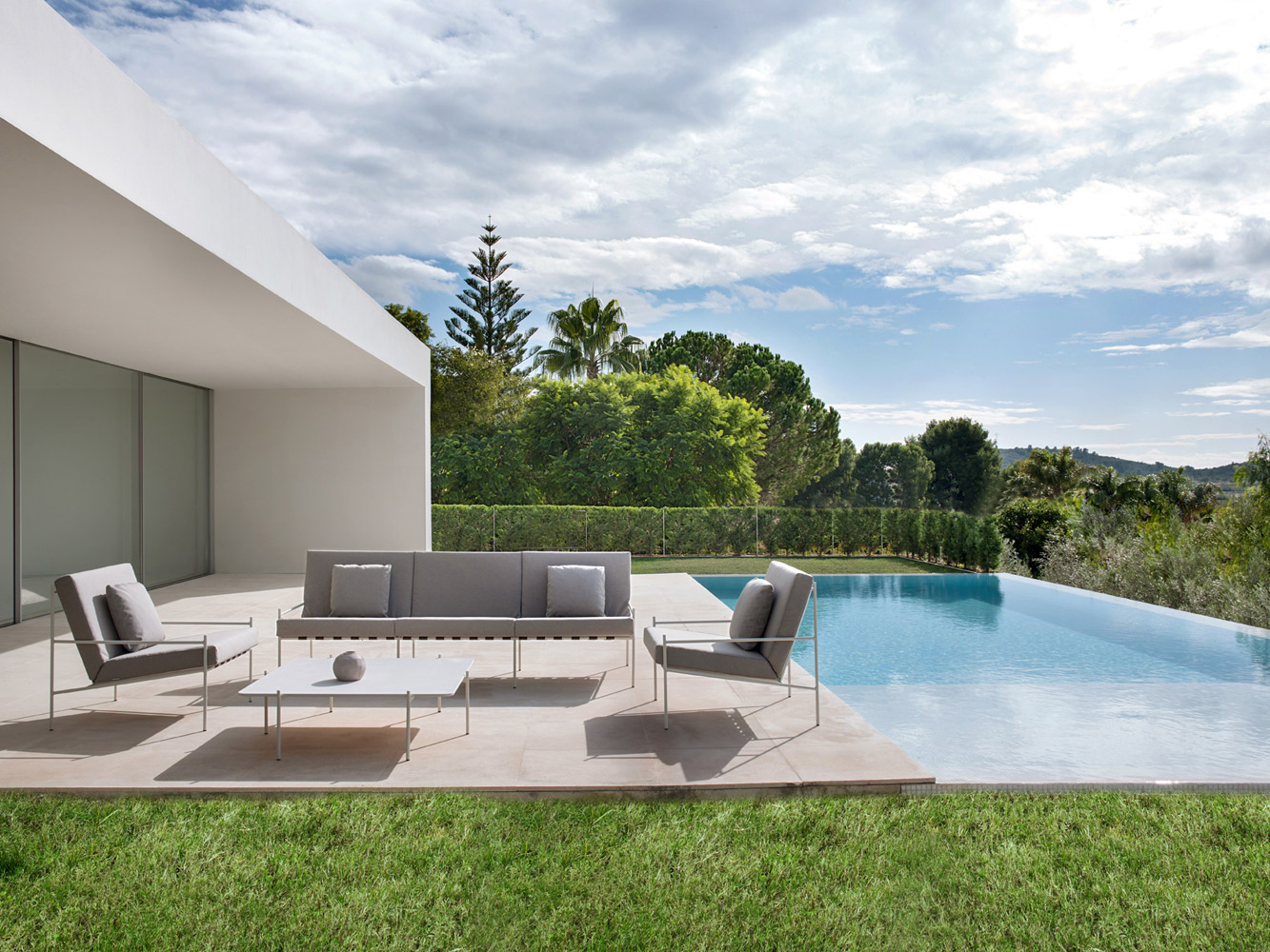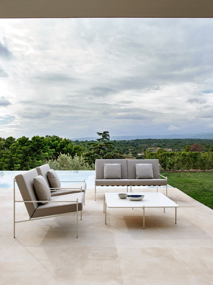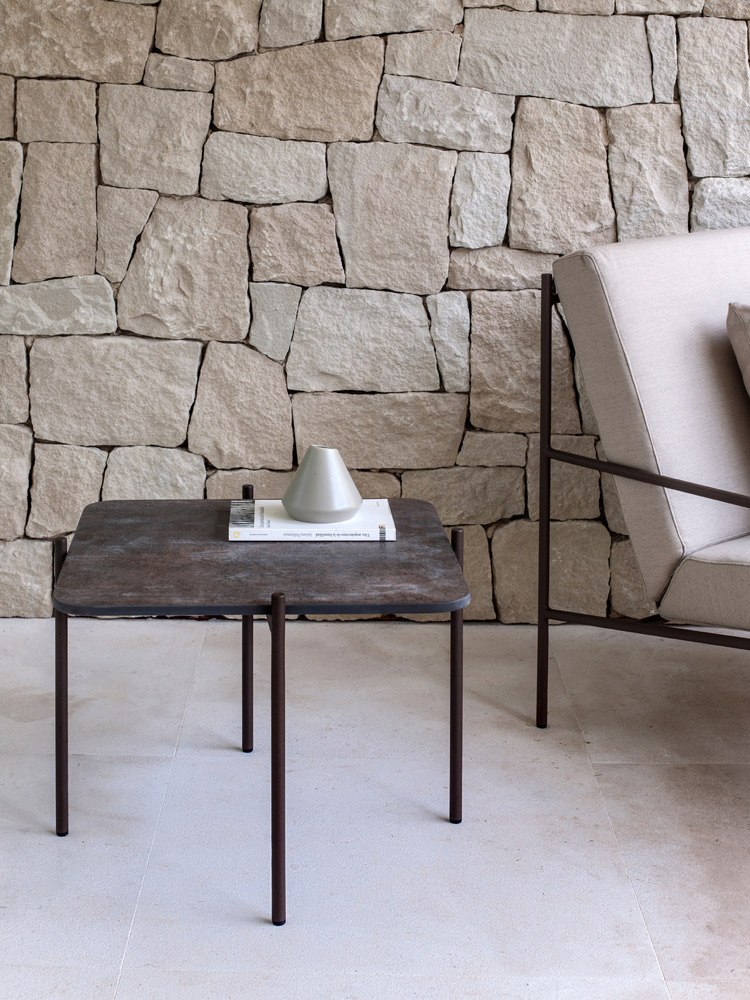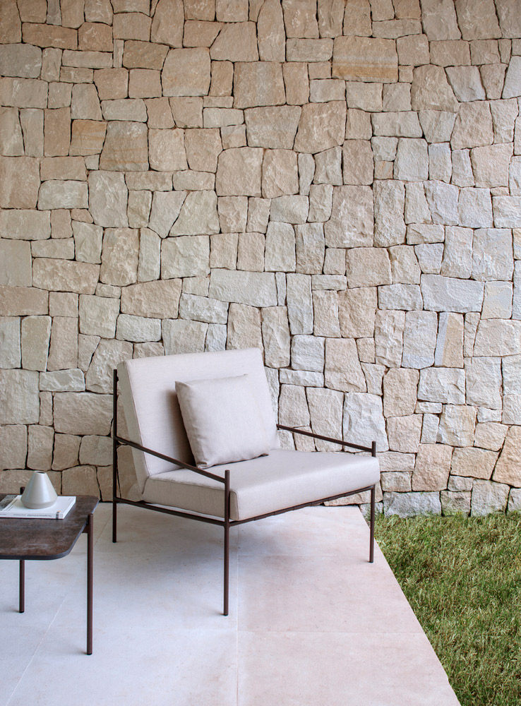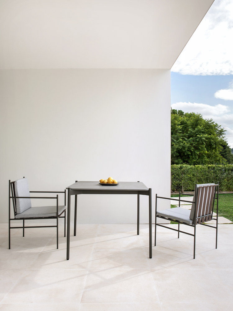 Min is a lightweight design that contemplates the crossing of metallic structures, creating strategic angles and simple geometric shapes. It is characterised by a base of stretched ribbons that contributes to the unusual personality of the armchair, while serving to support the cushions.