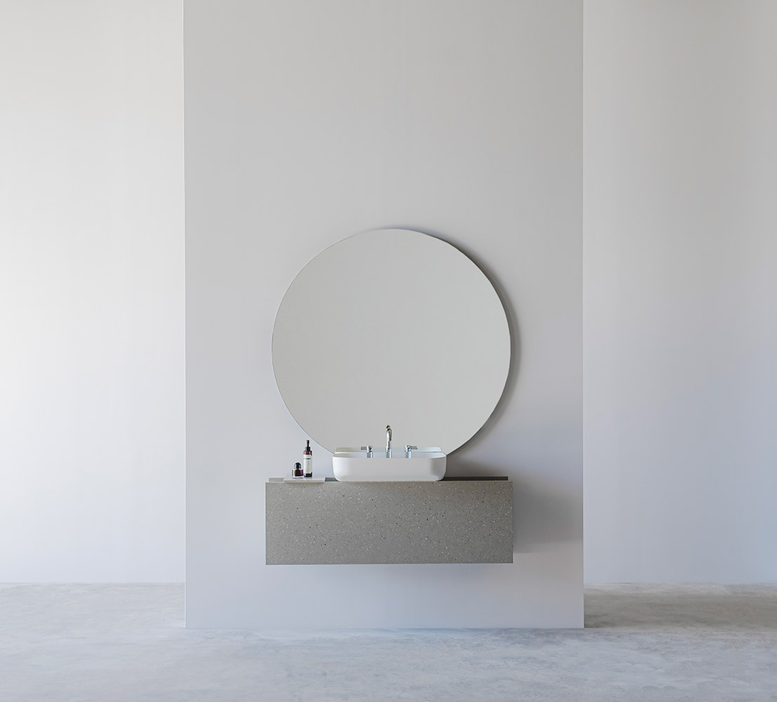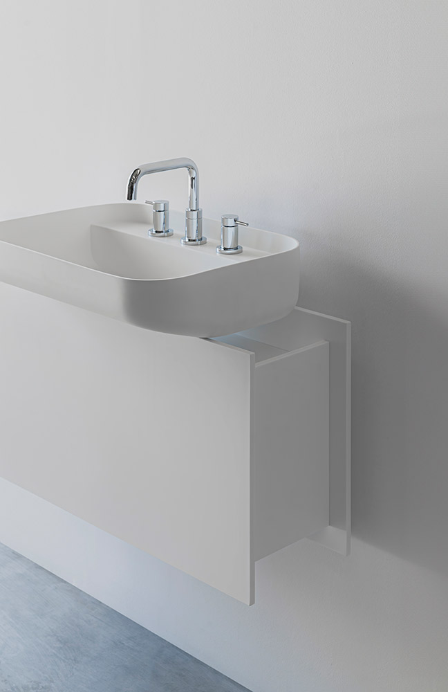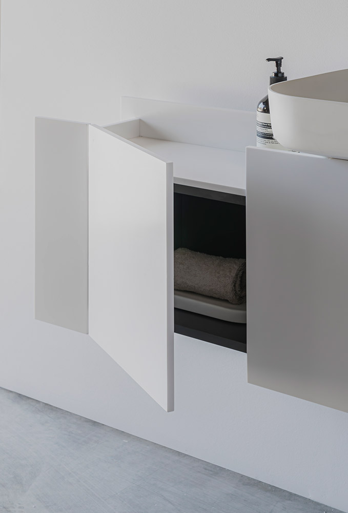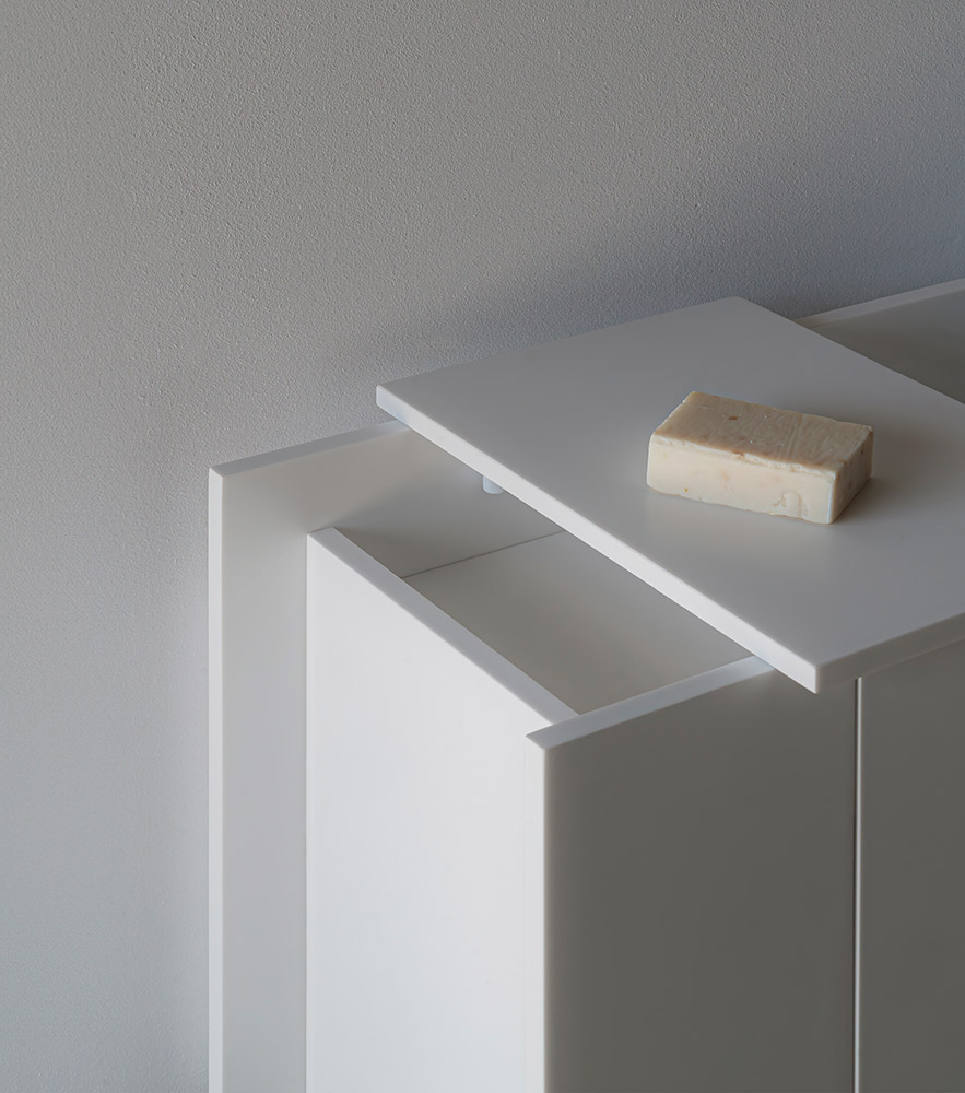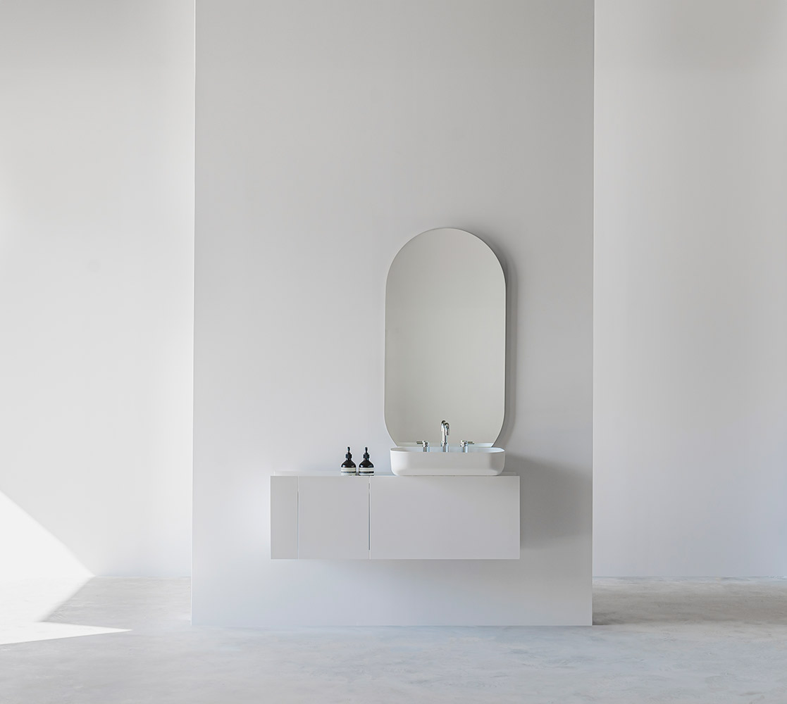 An ingenious bathroom design proposal focusing on storage. The base evokes the straight shapes of traditional construction elements such as beams or profiles, thanks to its simple yet solid design. The empty spaces between the lines offer unique organization opportunities for bathroom items, while the sink features a user-friendly rounded format.
