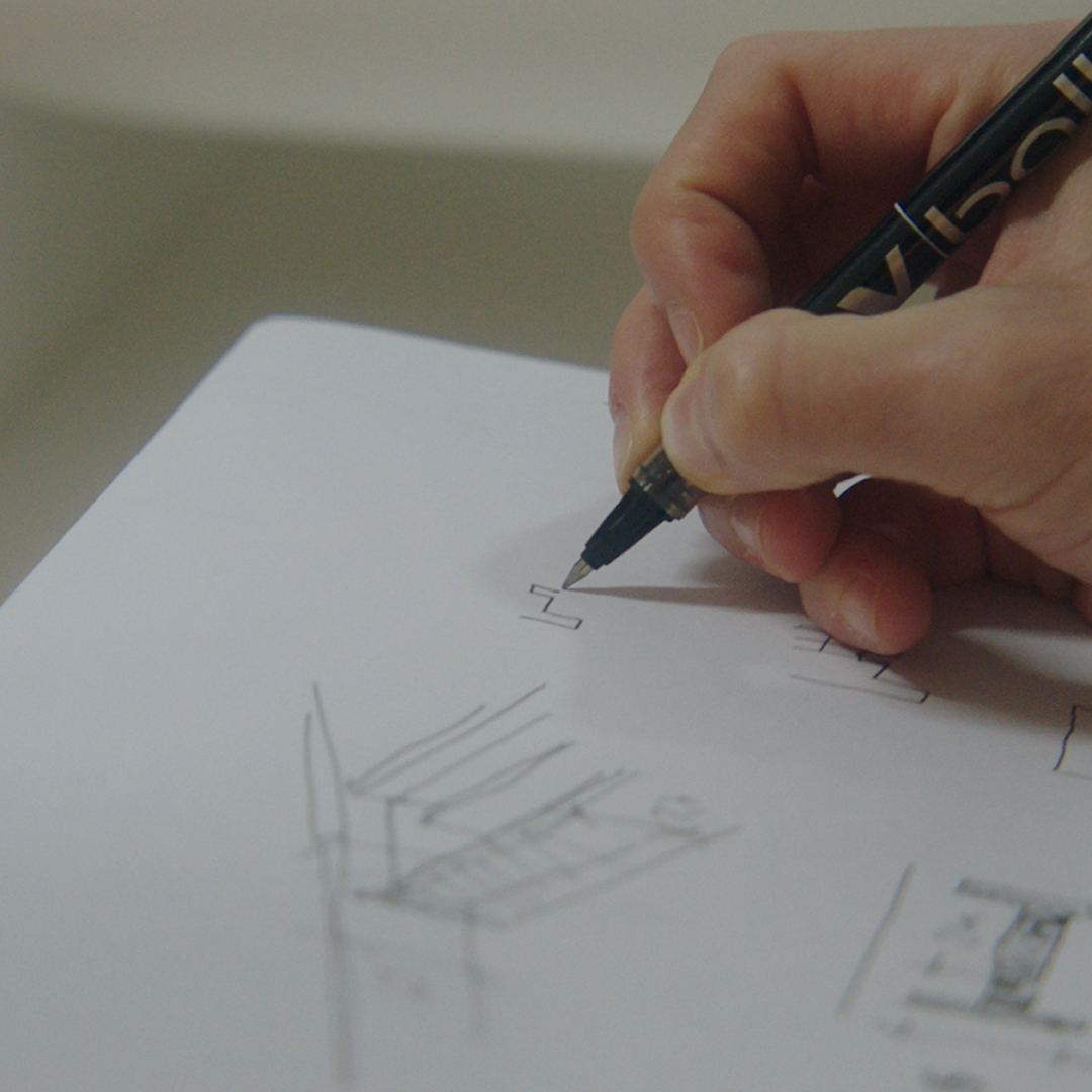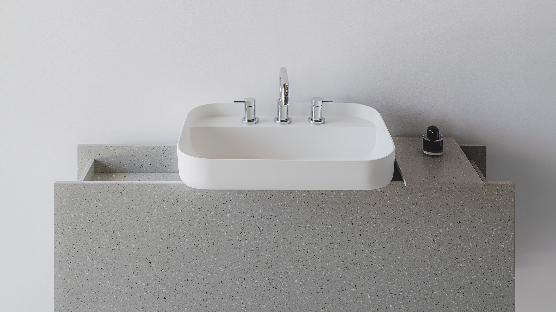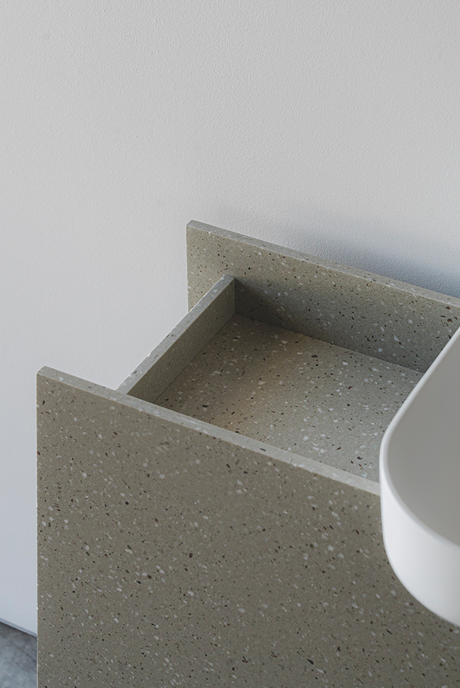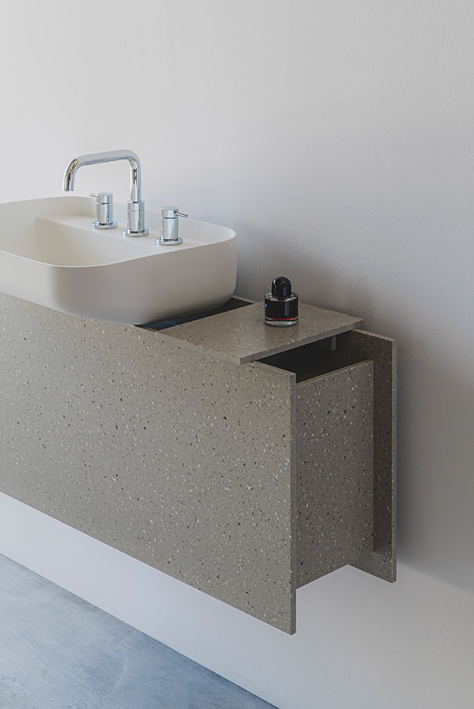 An ingenious bathroom design proposal focusing on storage. The base evokes the straight shapes of traditional construction elements such as beams or profiles, thanks to its simple yet solid design. The empty spaces between the lines offer unique organization opportunities for bathroom items, while the sink features a user-friendly rounded format.