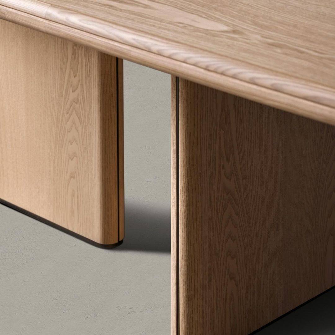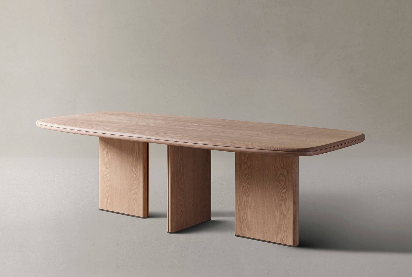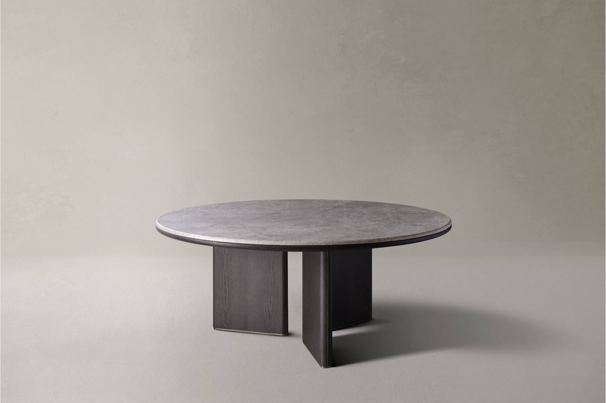 A table that embraces the concept of haute couture not only for its aesthetic connotations but also for the meticulous process behind its creation. Both the tabletop variations and the legs are divided into two planes by an exquisite metallic detail that gives the piece its unique character. This gesture also allows the upper surface of the tabletop to be customised with a second material.